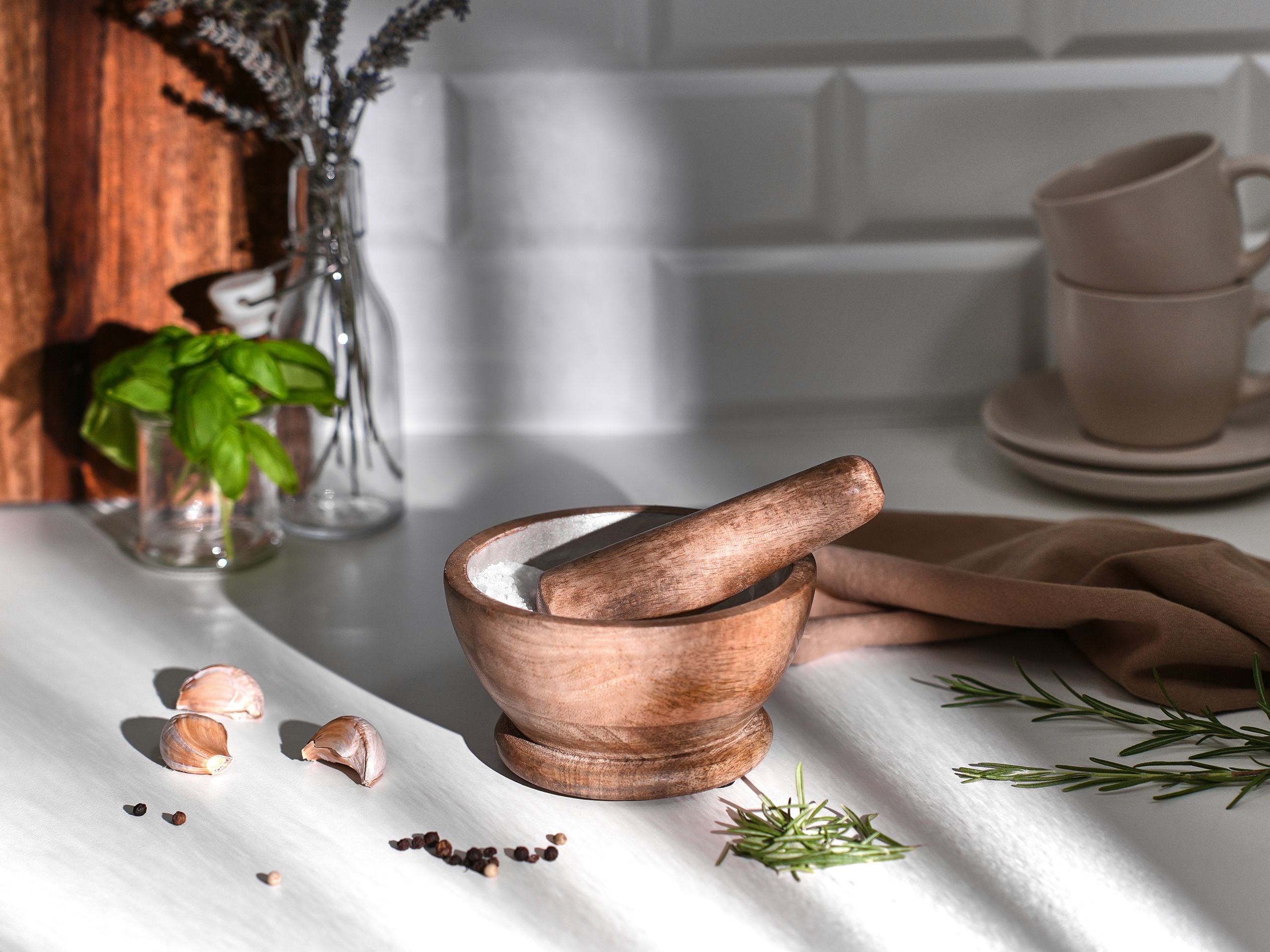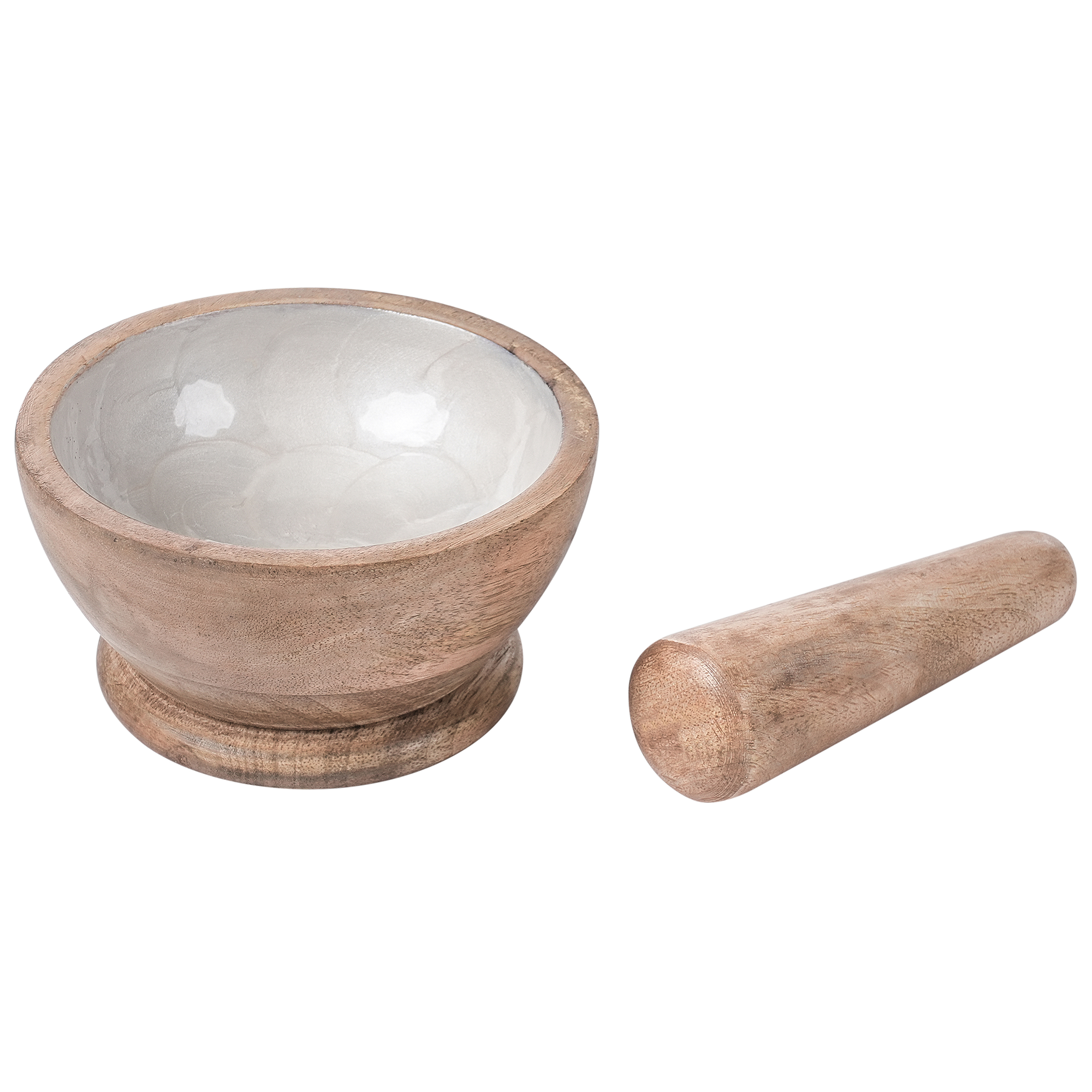 Käsintehty puinen huhmare ja survin. Tämä kätevä mortteli on käytännöllinen ja tyylikäs lisä jokaiseen keittiöön. Luonnollisesta mangopuusta valmistetun kulhon sisäosa on viimeistelty hartsilla, mikä takaa kestävyyden, kun taas mangopuinen survin tekee mausteiden hienontamisesta tai avokadon ja peston valmistamisesta helppoa. Ajaton muotoilu sulautuu monenlaisiin sisustustyyleihin.