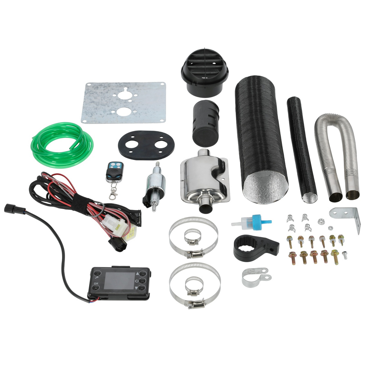 Lämmitinyksikkö ohjaintaululla, Kaukosäädin, Ilmansuodatin, Ilmaputken verkkosuoja, Äänenvaimennin, Sähköjohdot, Aluslevy, polttoainepumppu, polttoaineletkut, Ilman sisään- ja ulostuloletkut, Kiristimet ja ruuvit, 5 litran polttoainetankki, Pakoputki