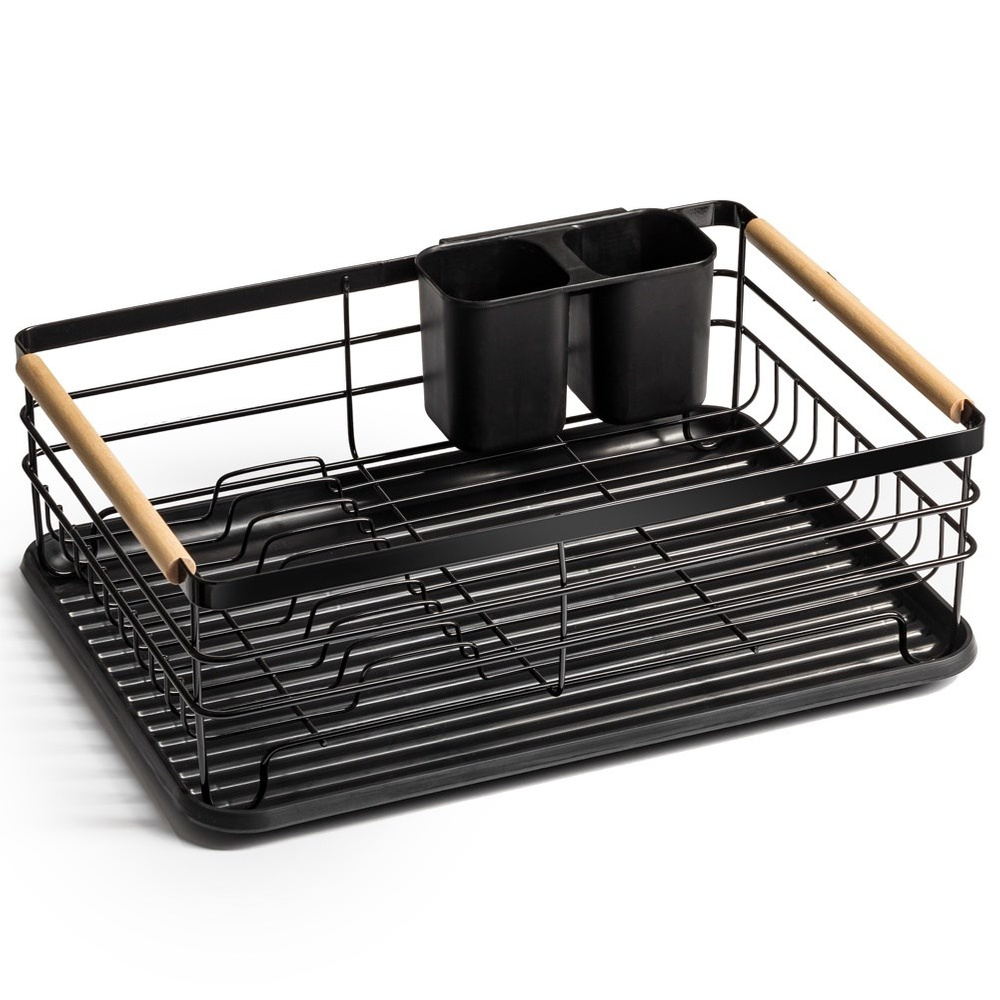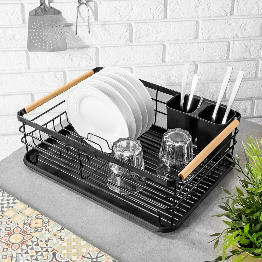 KIINTEÄ - Astiankuivausalusta, joka on valmistettu mustasta ruostumattomasta metallista. Varustettu irrotettavalla tarjottimella ja aterinkuivausalustalla, jotka on valmistettu korkealaatuisesta mustasta muovista.