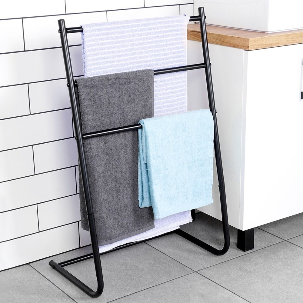 Kolme kuivaustankoa - Telineessä on kolme vakaata tankoa, joiden avulla voit säilyttää pyyhkeitä eri tasoilla.