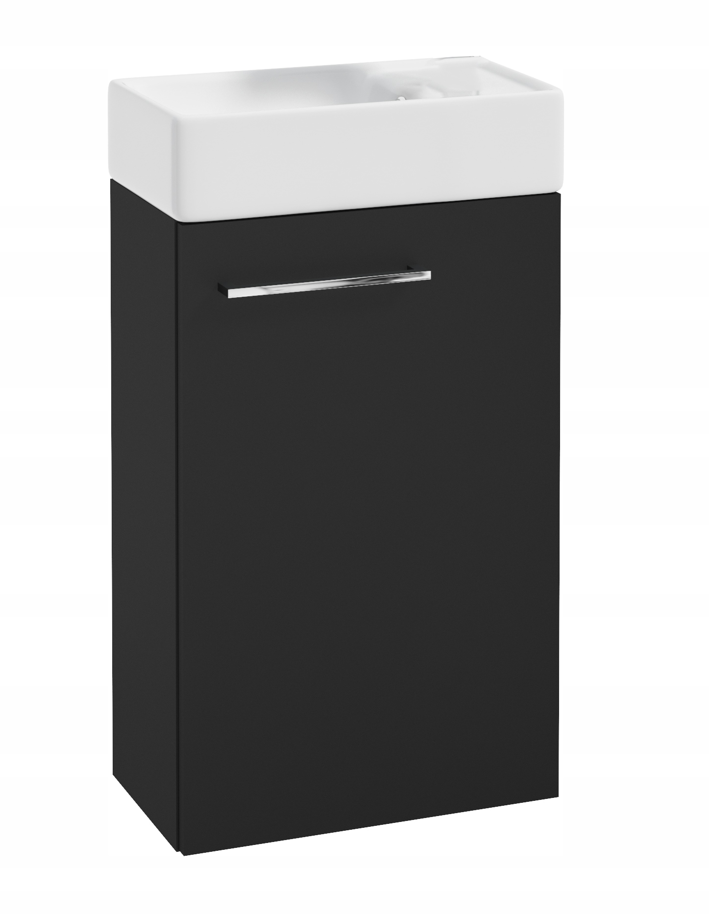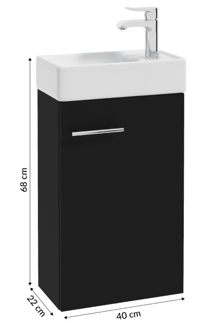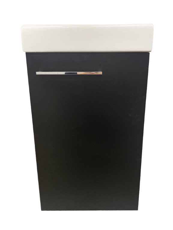 Musta seinään ripustettava kylpyhuonekaappi, jossa 60x40 pesuallas ja pieni kromi kompakti hana