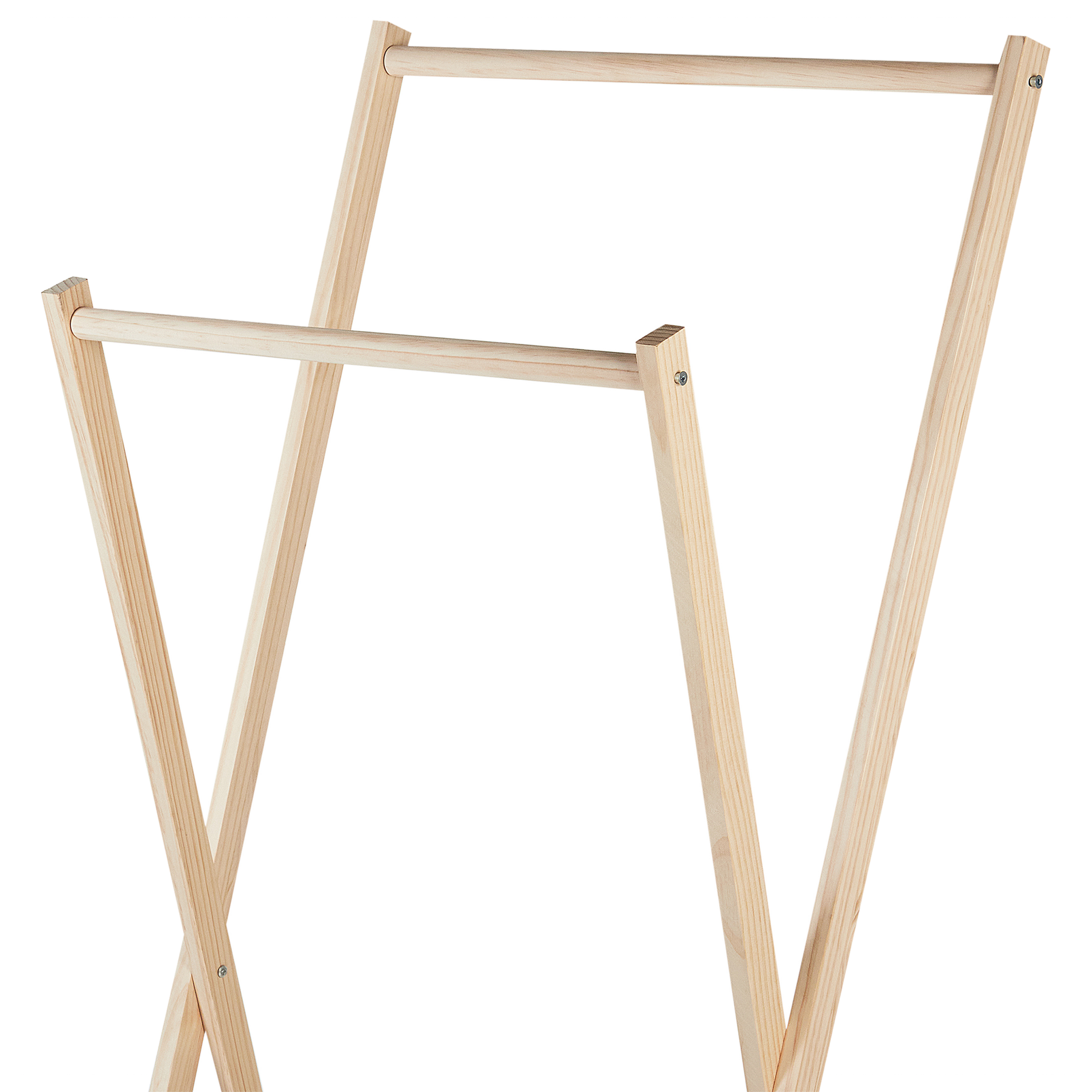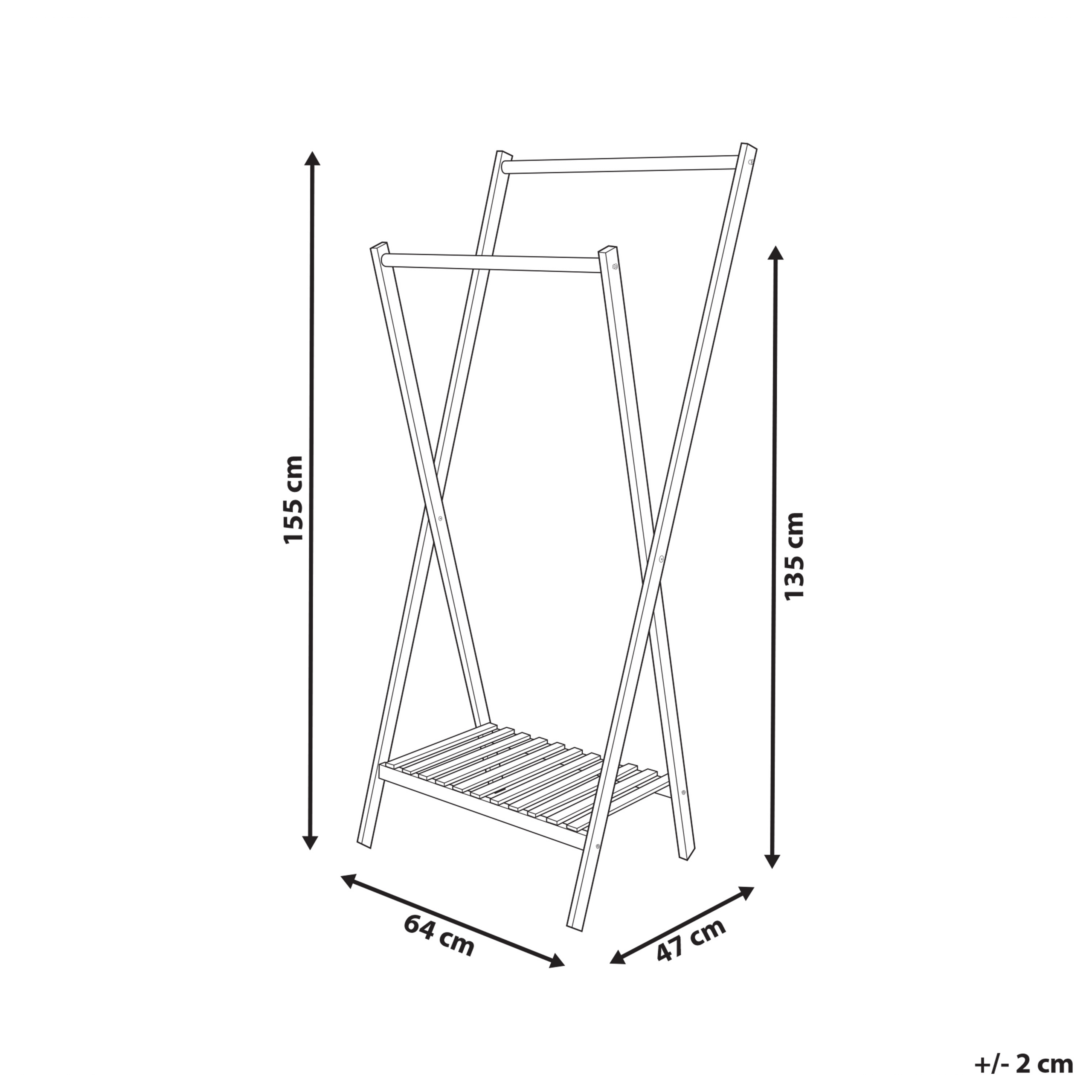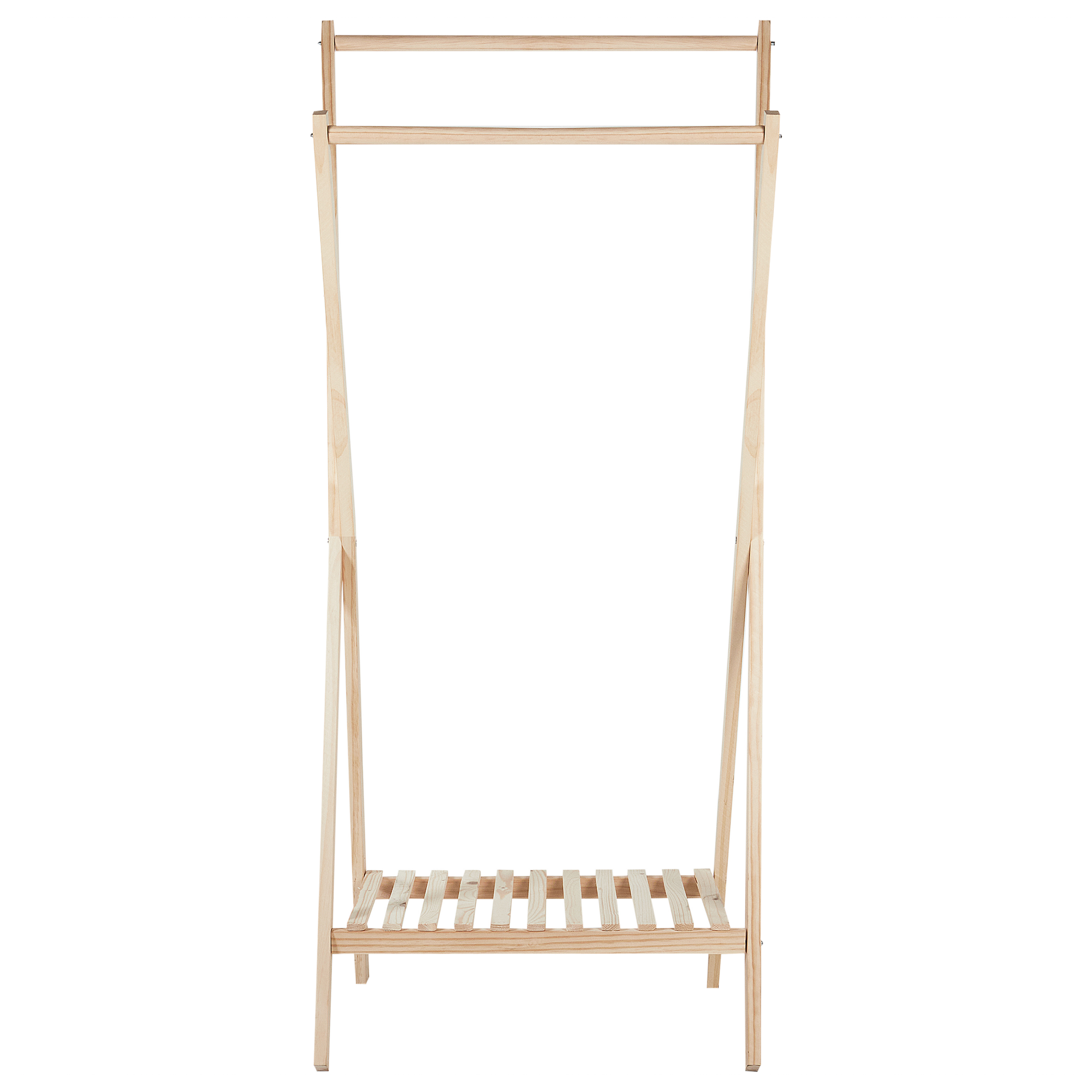 Käsintehty vaateteline hyllyllä. Vaaleasta luonnonjalokuusesta valmistettu rustiikkinen naulakko on sekä toimiva että tyylikäs. Kokoontaitettava muotoilu tarjoaa joustavuutta, mahdollistaen helpon säilytettävyyden. Vaatetelineessä on kaksi tankoa, jotka tarjoavat runsaasti tilaa vaatteiden ripustamiseen, sekä alahylly, jolle mahtuu kenkiä tai koreja. Naulakko tuo lämmintä, orgaanista ilmettä jokaiseen moderniin eteiseen tai makuuhuoneeseen, pitäen välttämättömät vaatteet siististi järjestyksessä.