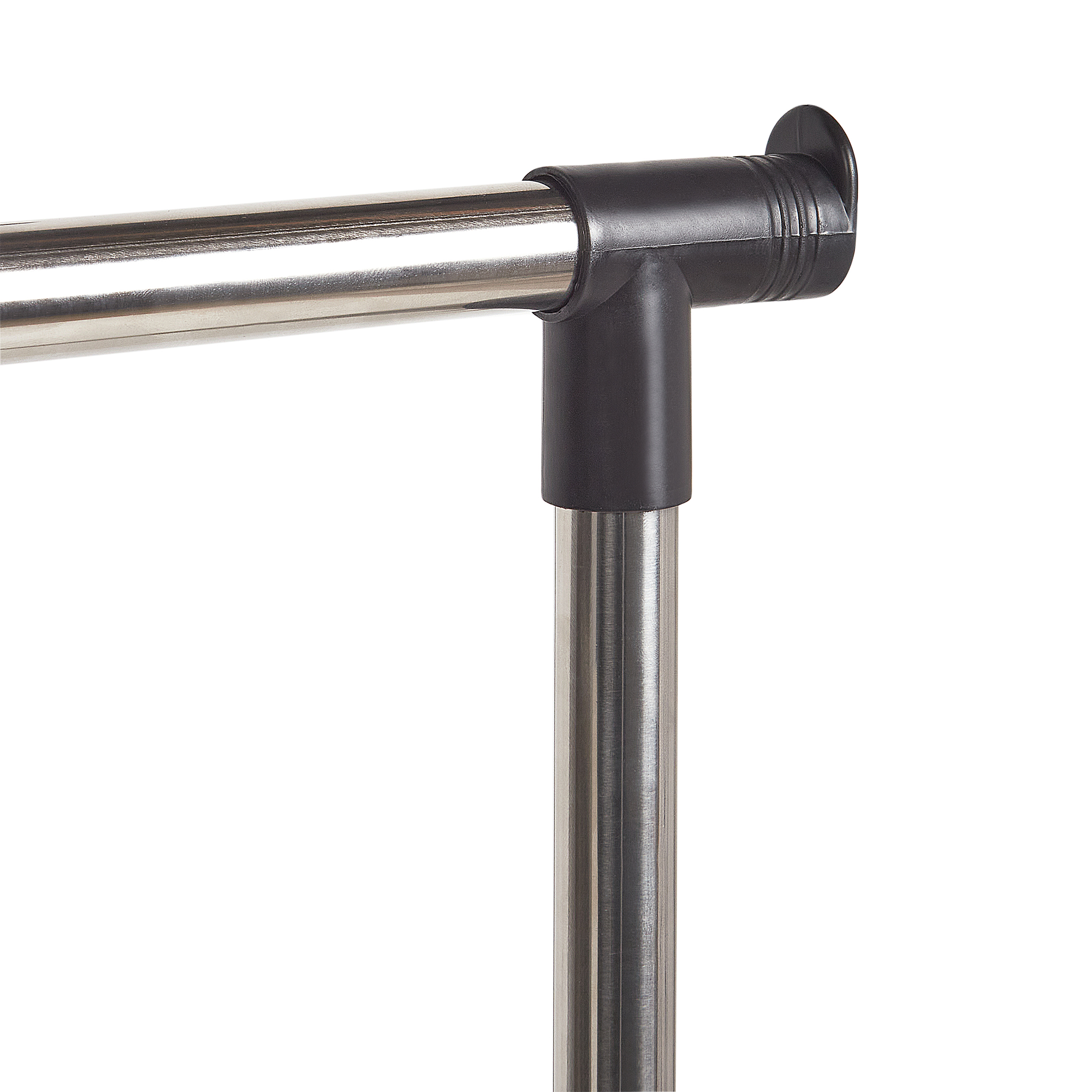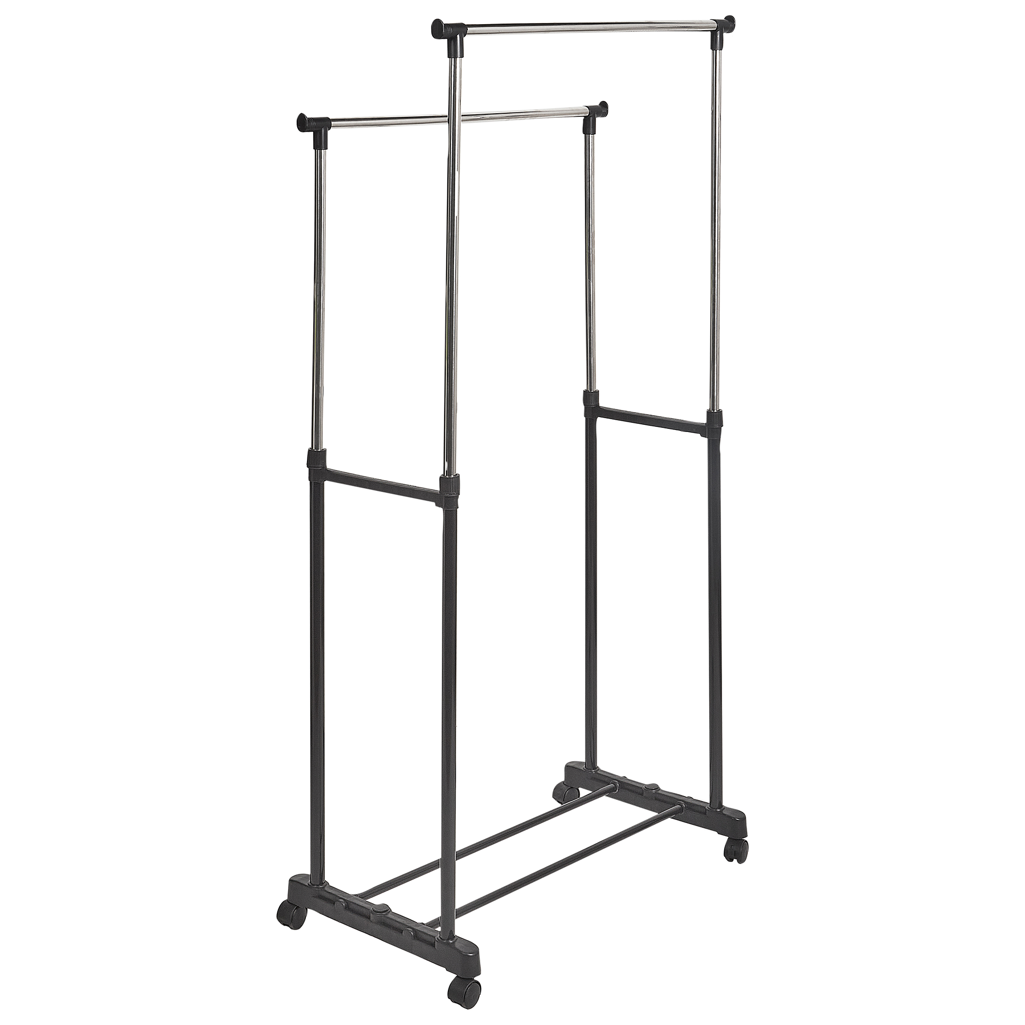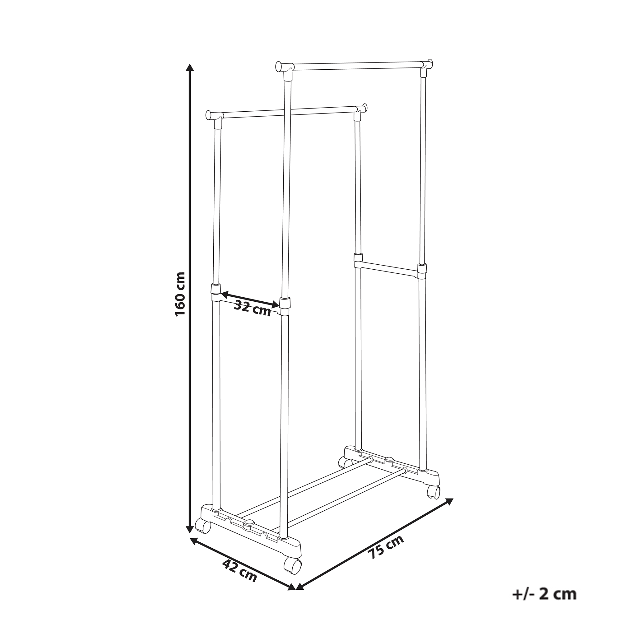 Moderni vaateteline. Tämä käytännöllinen vaateteline on valmistettu kestävästä metallista, jossa on kaksi runsaasti säilytystilaa tarjoavaa tankoa. Pohjassa olevien pyörien ansiosta vaatetelinettä on helppo liikuttaa ja se tarjoaa monipuolisen ratkaisun vaatteiden, takkien ja asusteiden ripustamiseen. Tämä teline sopii sekä pieniin että suuriin tiloihin, ja se auttaa pitämään vaatekaappisi järjestyksessä helposti siirrettävyytensä ansiosta.