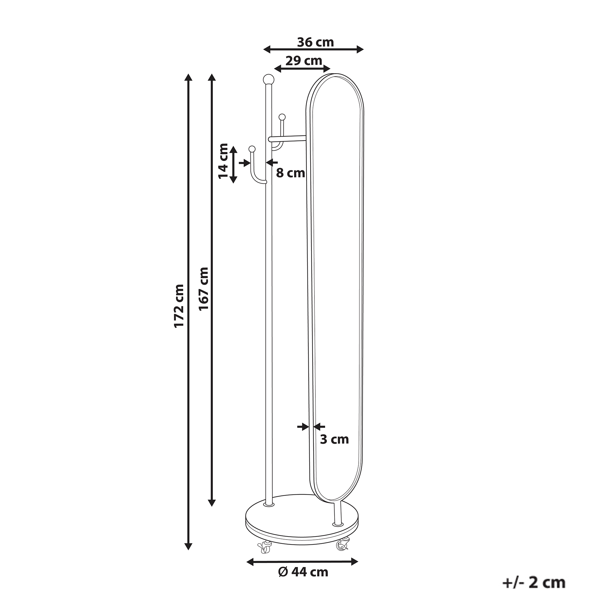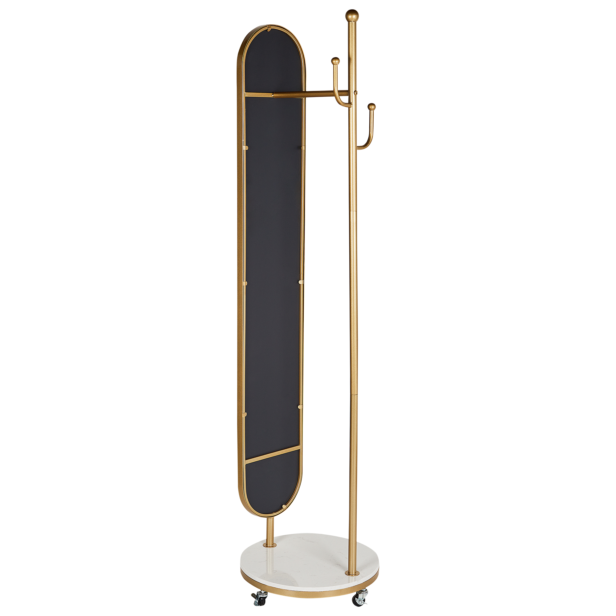 Moderni pystynaulakko peilillä. Tässä monipuolisessa naulakossa yhdistyvät käytännöllisyys sekä elegantti muotoilu, ja sen täysipitkä peili sopii täydellisesti viime hetken asujen tarkistamiseen. Naulakko on valmistettu kultaisesta metallirungosta ja tukevasta marmorijalustasta, jossa on pyörät helpottamaan liikuttamista, sekä koukut takkien, sateenvarjojen ja laukkujen ripustamista varten. Tämä naulakko on tyylikäs ja toiminnallinen kappale mihin tahansa moderniin eteiseen tai makuuhuoneeseen.