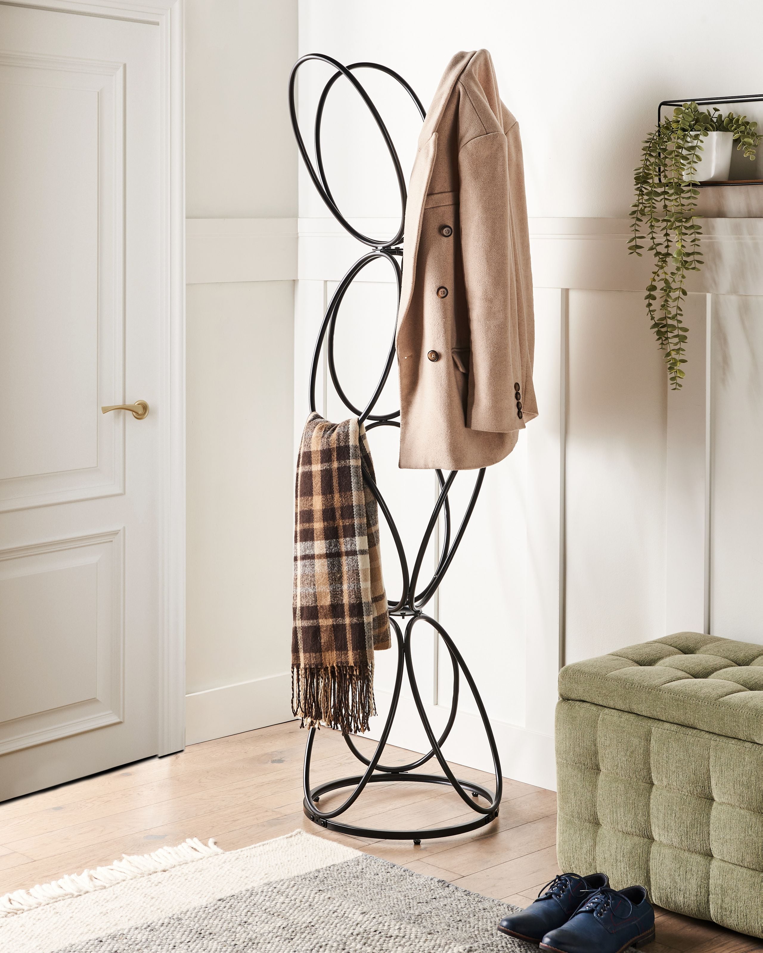 Moderni koristeellinen pystynaulakko. Tämä ainutlaatuisesti muotoiltu teräsnaulakko yhdistää täydellisesti tyylin ja toiminnallisuuden. Se tarjoaa paikan takkien ja asusteiden ripustamiseen sekä toimii samalla minkä tahansa tilan näyttävänä aksenttina. Vankka rakenne ja abstrakti, geometrinen muoto luovat modernin vaihtoehdon perinteiselle pystynaulakolle, joka tuo kotiin hienostuneisuutta ja pitää välttämättömät esineet siistissä järjestyksessä.