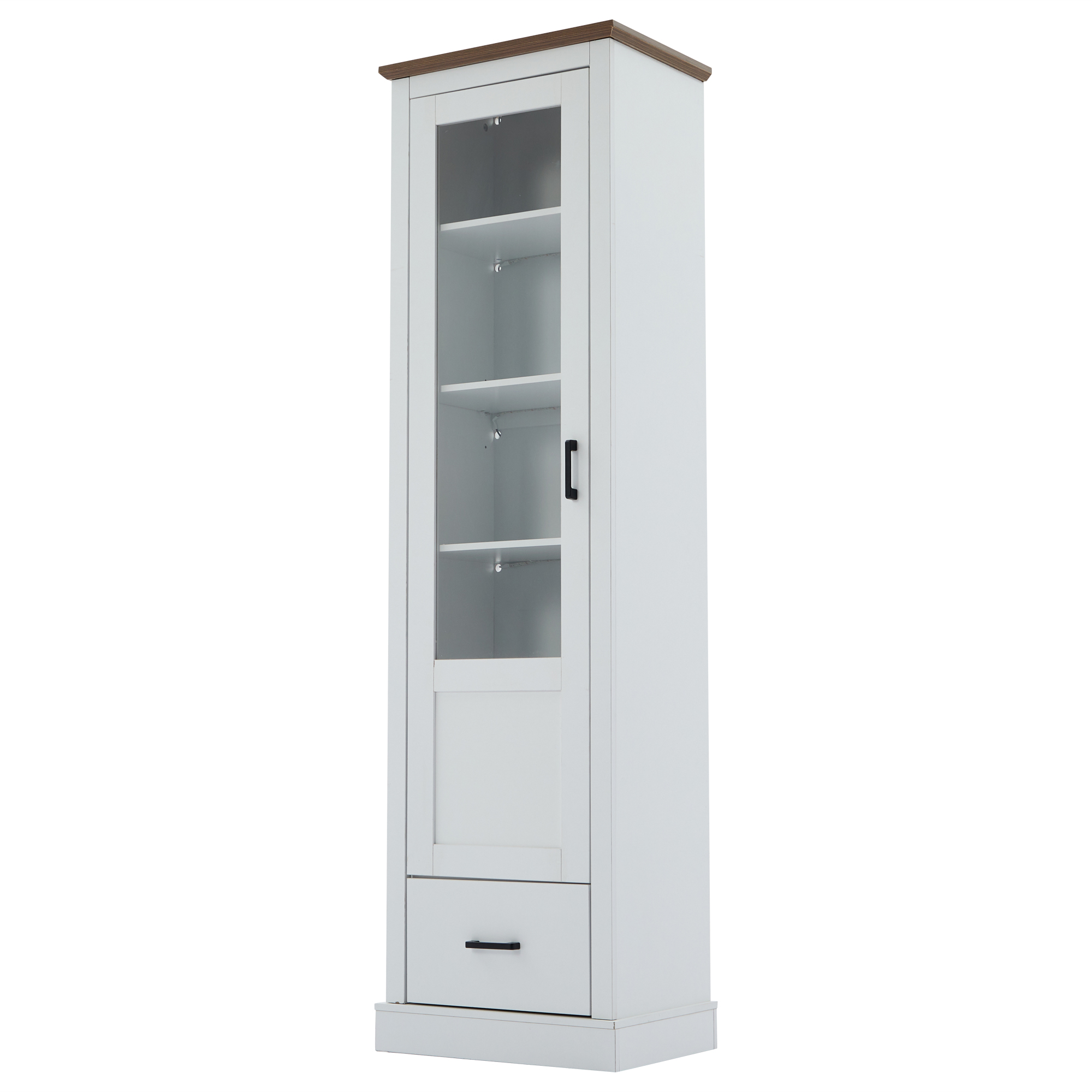 Optimaalinen säilytystila: 5 avokätistä hyllyä, joiden kantavuus on 20 kg kpl, tarjoaa runsaasti tilaa. Alalaatikko kestää jopa 30 kg ja mahdollistaa lisäpiilotilan. Tyylikäs muotoilu: Solakka profiili (178x50x35cm) tekee vitriinistä täydellisen huomionkiinnottimen. Valkoisen ja luonnonpuukoristeen yhdistelmä sopii harmonisesti mihin tahansa asusteluun.
