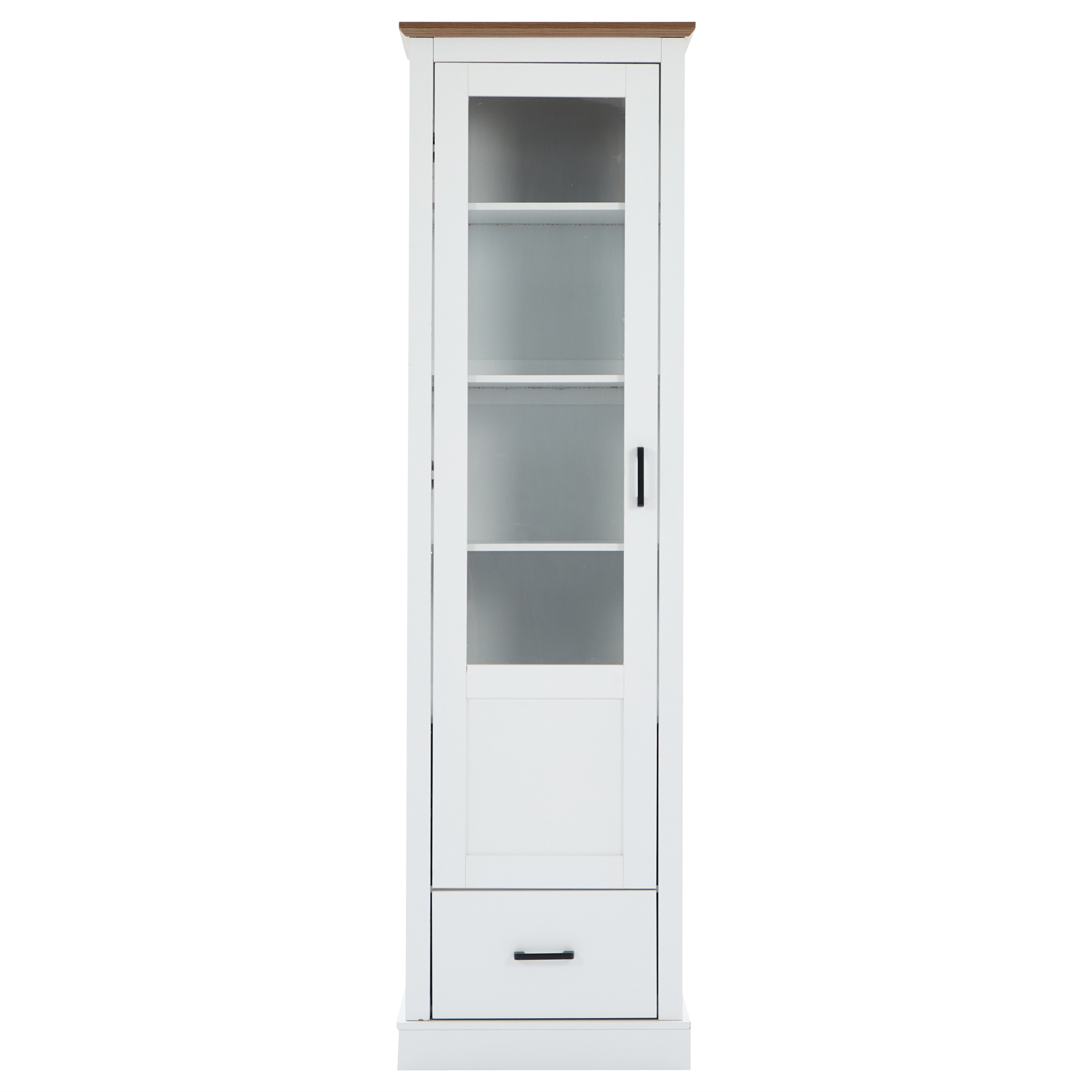 Kaapin ulkonäkö sopii moneen sisustukseen: valkoinen mattapinta ja luonnonvärinen yläkoriste tuovat lämpöä ja raikkautta huoneeseen. Ohuen ja korkean muodon ansiosta vitriini on hyvä ratkaisu myös pieniin tiloihin, joissa tarvitaan säilytystilaa mutta halutaan välttää raskasta vaikutelmaa. Käytön ja siirtelyn helpottamiseksi kaappi toimitetaan kahdessa tukevassa paketissa ja mukana on selkeät kokoamisohjeet.