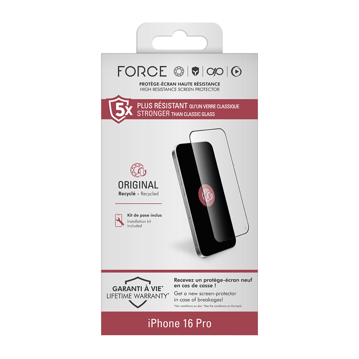 Tämä Force Glass -näytönsuoja iPhone 16 Pro -puhelimelle on valmistettu korkealaatuisesta 2,5D-orgaanisesta lasista. Se on naarmuuntumisen ja paineen kestävä. Lasi on oleofobinen ja sormenjäljen kestävä. Räjähdyssuojaus auttaa välttämään vaaralliset sirpaleet, jos lasiin kohdistuu voimakkaita iskuja. Lasi on erittäin läpinäkyvä, erittäin kosketusherkkä ja pehmeän tuntuinen.