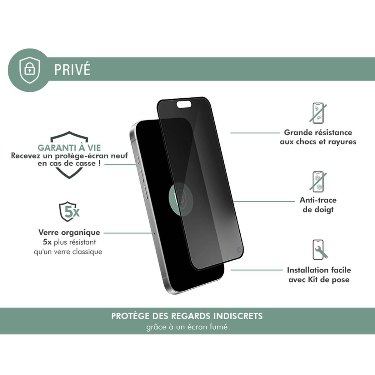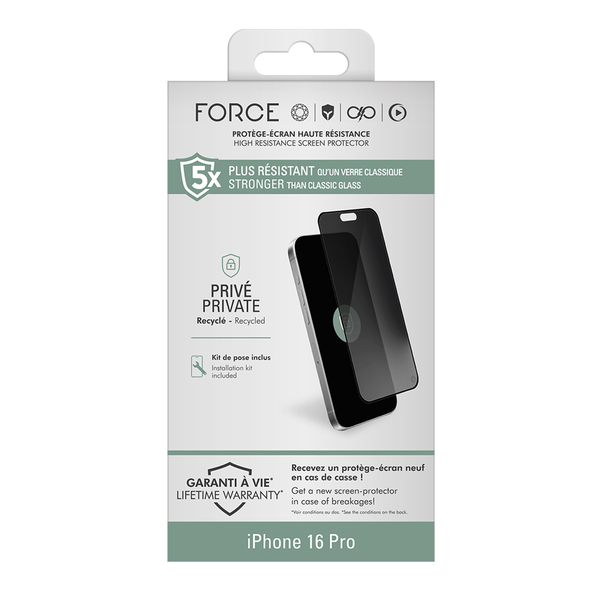 Tämä Force Glass -näytönsuoja iPhone 16 Pro -puhelimelle on valmistettu naarmuuntumis- ja paineenkestävästä 2,5D 9H+ orgaanisesta lasista. Lasi on oleofobinen ja sormenjälkiä estävä. Siinä on integroitu yksityisyyssuodatin, joka suojaa uteliailta katseilta. Räjähdyssuojattu rakenne auttaa välttämään vaaralliset sirpaleet, jos lasiin kohdistuu voimakas isku.