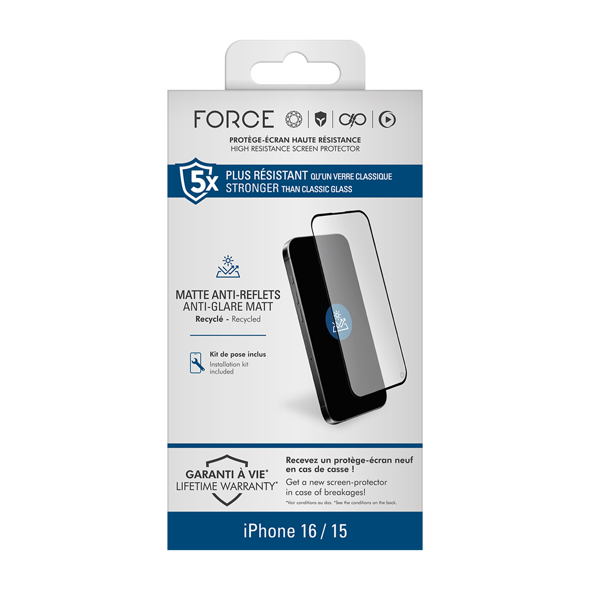 Tämä Force matta näytönsuoja on suunniteltu iPhone 16, 15 ja 14 Pro. Se on valmistettu kierrätetystä orgaanisesta lasista, ja se tarjoaa erinomaisen naarmuuntumis- ja iskunkestävyyden, vähentää häikäisyä ja takaa sileän tuntuman. Sen mukana tulee biohajoava asennussarja tarkkaa, kuplatonta asennusta varten.