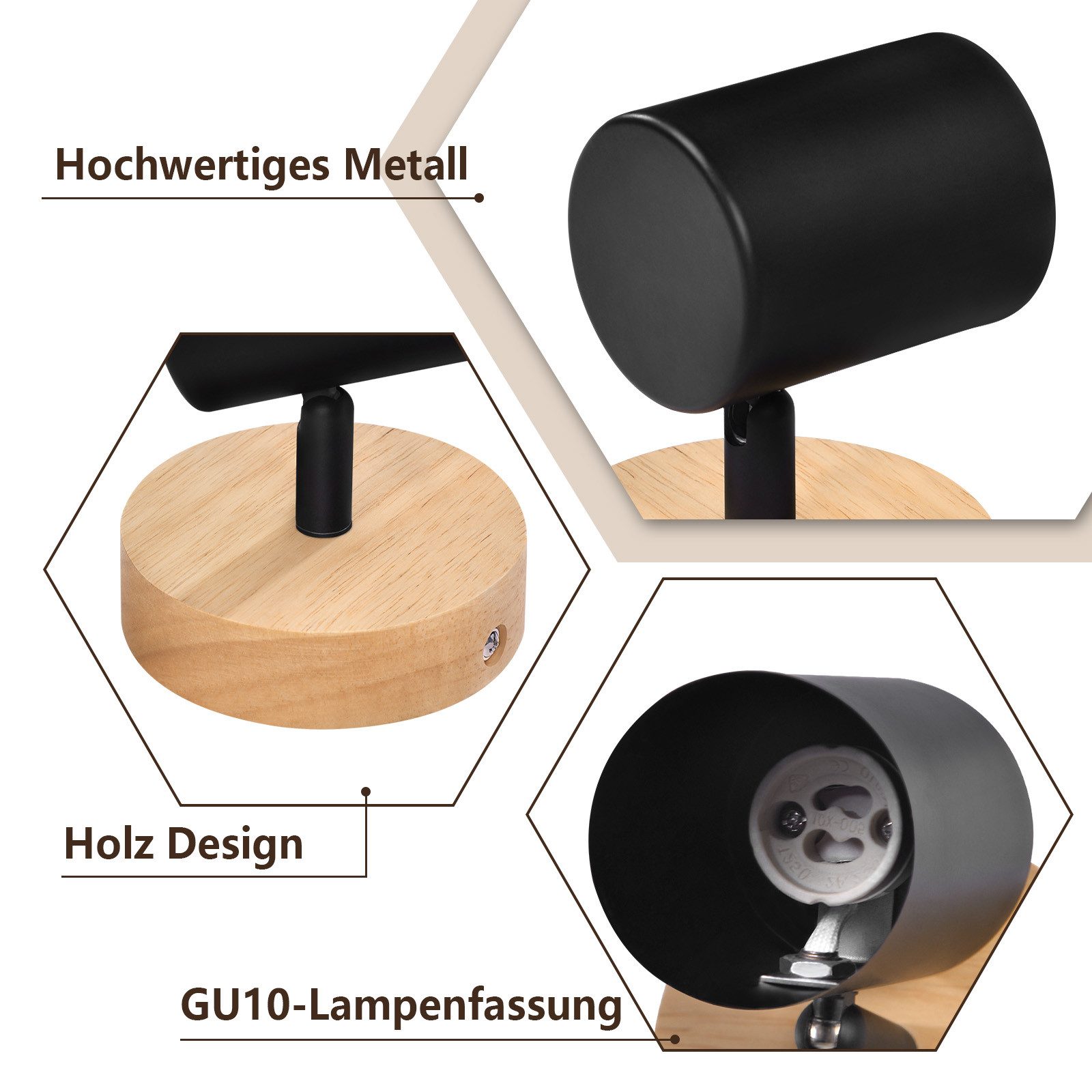 Tämän modernin LED-kattospotin pohja on valmistettu luonnonpuusta, joka säilyttää luonnollisen tekstuurinsa, ja lampunvarjostin on valmistettu korkealaatuisesta metallista, mikä tekee siitä kestävän, turvallisen ja luotettavan. Yksinkertaisen muotoilunsa ansiosta tämä puinen seinävalaisin sopii paitsi retro-teolliseen sisustukseen, myös luo tyylikkään tunnelman moderneihin asuintiloihin. Kääntyvä ja pyörivä: LED-kattospotteja voidaan kallistaa 90° ja pyörittää 350°, mikä mahdollistaa joustavan asennuksen seinälle tai kattoon. Niitä voidaan kallistaa eri suuntiin tarpeen mukaan valaisemaan eri alueita huoneessa. Monipuolinen kohdevalaisin: Tämä moderni puinen kattospotti voidaan asentaa kattoon paitsi olohuoneen, työhuoneen ja makuuhuoneen valaistukseen, myös seinävalaisimeksi. Tämän kattovalaisimen muotoilu on moderni ja yksinkertainen, joten se sopii erilaisiin paikkoihin, kuten keittiöön, lastenhuoneeseen, eteiseen, toimistoon jne. GU10-kanta: Kattovalaisin on varustettu GU10-kannalla, joten voit vapaasti valita erilaisia lampputyyppejä ja täyttää yksilölliset valaistustarpeet luodaksesi erilaisia tunnelmia. Huomautus: Tuotteemme eivät sisällä lamppuja.