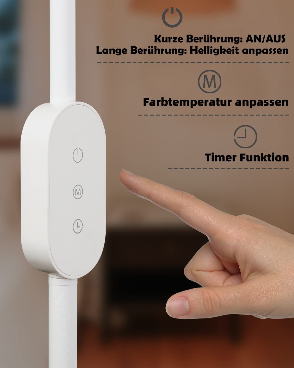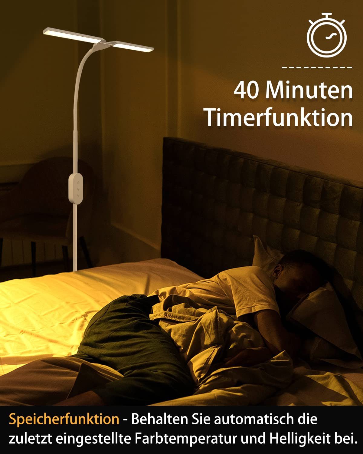 Lattialampussa on 40 minuutin ajastintoiminto. Painamalla ajastinnäppäintä pitkään lamppu vilkkuu kahdesti, ja ajastin aktivoituu – laite sammuu automaattisesti 40 minuutin kuluttua. Lisäksi lukulamppu säilyttää muistissaan viimeisimmän väriasteen ja kirkkaustason, kunhan laite pysyy kytkettynä verkkovirtaan.