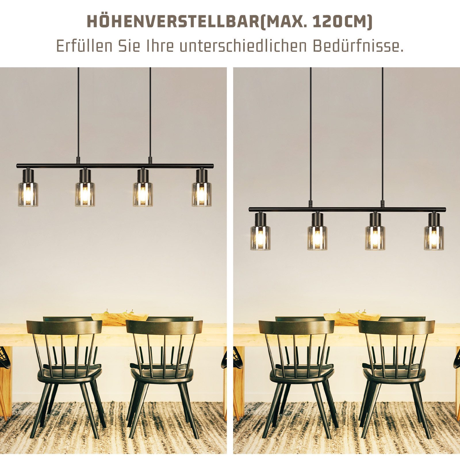 Tämä vintage-tyylinen neljän lampun lasinen riippuvalaisin tarjoaa houkuttelevan valaistusefektin ja sopii erinomaisesti ruokailuhuoneisiin, keittiöihin ja olohuoneisiin. Se sopii myös suurille ruokapöydille, tiskille, baareille ja keittiösaarekkeille.
