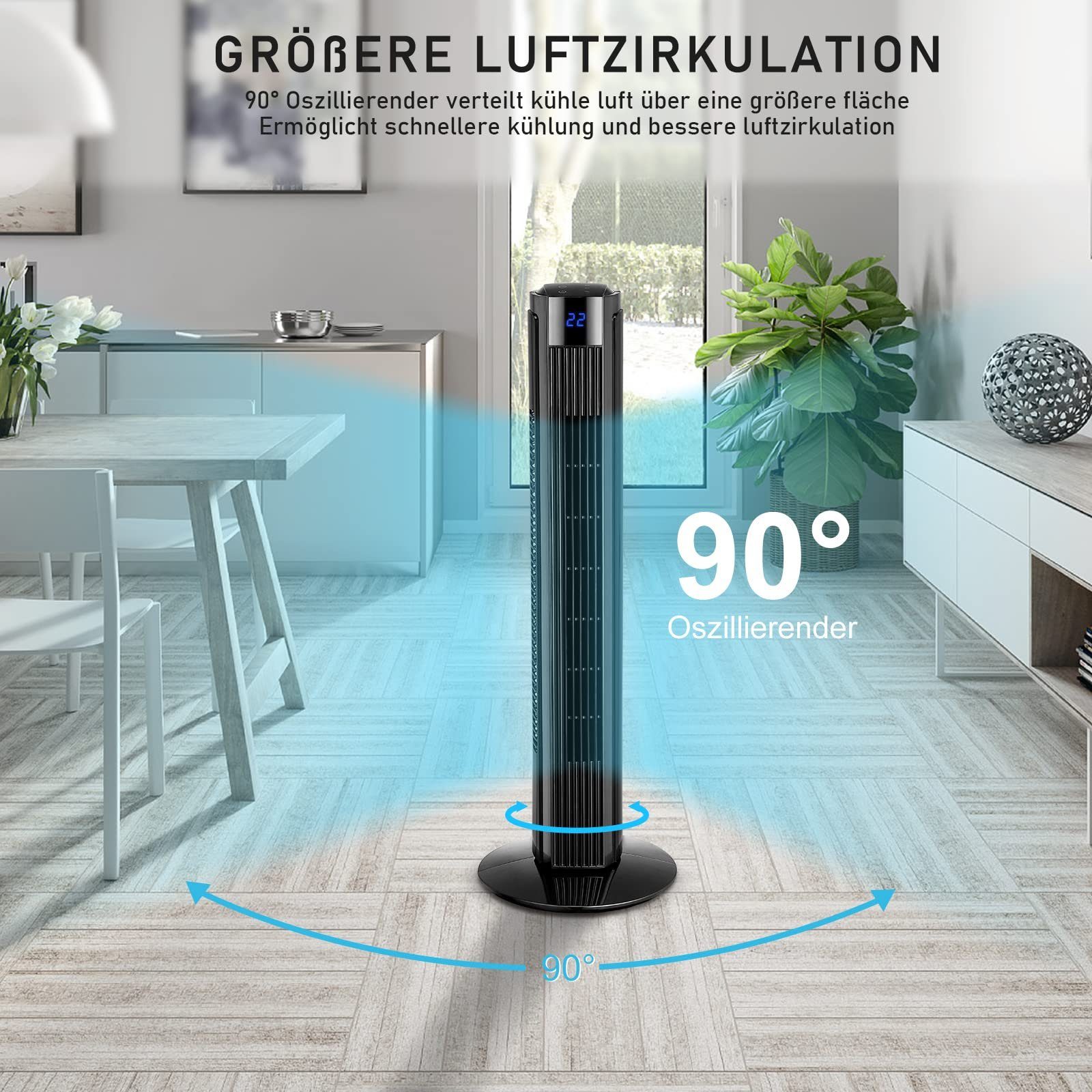 Tehokas ilmankierto: Tehokkaan 40 W:n moottorin ja suuren ilmanpoistoaukon ansiosta tornituulettimemme takaa raikkaan ilman nopeasti ja tehokkaasti kotona tai toimistossa. LED-näyttö ja kaukosäädin: Tornituulettimessamme on selkeä LED-näyttö, joka näyttää laitteen nykyisen toimintatilan ja huoneen lämpötilan. Integroidun kaukosäätimen avulla voit helposti säätää ilmavirtaa etäältä ilman, että sinun tarvitsee nousta ylös. Tämä tarkoittaa, että voit nauttia maksimaalisesta mukavuudesta ja hallita sisäilmastoasi. Monipuoliset nopeustasot ja laaja oskillaatio: Tornituulettimessamme on kolme säädettävää ilmavirtausnopeutta ja erityinen yötila yksilöllisen mukavuuden takaamiseksi. Toisin kuin perinteiset mallit, joissa on 60°:n oskillaatiotoiminto, tuulettimemme mahdollistaa jopa 90°:n automaattisen oskillaation, mikä varmistaa tehokkaan ilman jakautumisen ja nopean huoneen jäähdytyksen. Monipuoliset käyttötarkoitukset: Tornituulettimemme ei sovellu ainoastaan olohuoneeseen tai toimistoon, vaan se on täydellinen myös leirintäalueille, matkailuautoihin, työpajoihin tai autotalleihin. Monipuolisten käyttökohteidensa ansiosta tornituulettimemme avulla voit nauttia miellyttävästä ja virkistävästä tuulahduksesta missä tahansa kuumina kesäpäivinä. Pitkäkestoinen viilennys tarkalla ajastimella:: Tornituulettimessamme on kätevä ajastintoiminto, jonka avulla voit säätää käyttöaikaa tarpeidesi mukaan. Nauti jatkuvasta viilennyksestä jopa 12 tuntia samalla kun teet muita toimintoja. Ajastin voidaan asettaa tarkasti 0,5 tunnin välein, joten voit helposti säätää ihanteellisen viilennysajan.