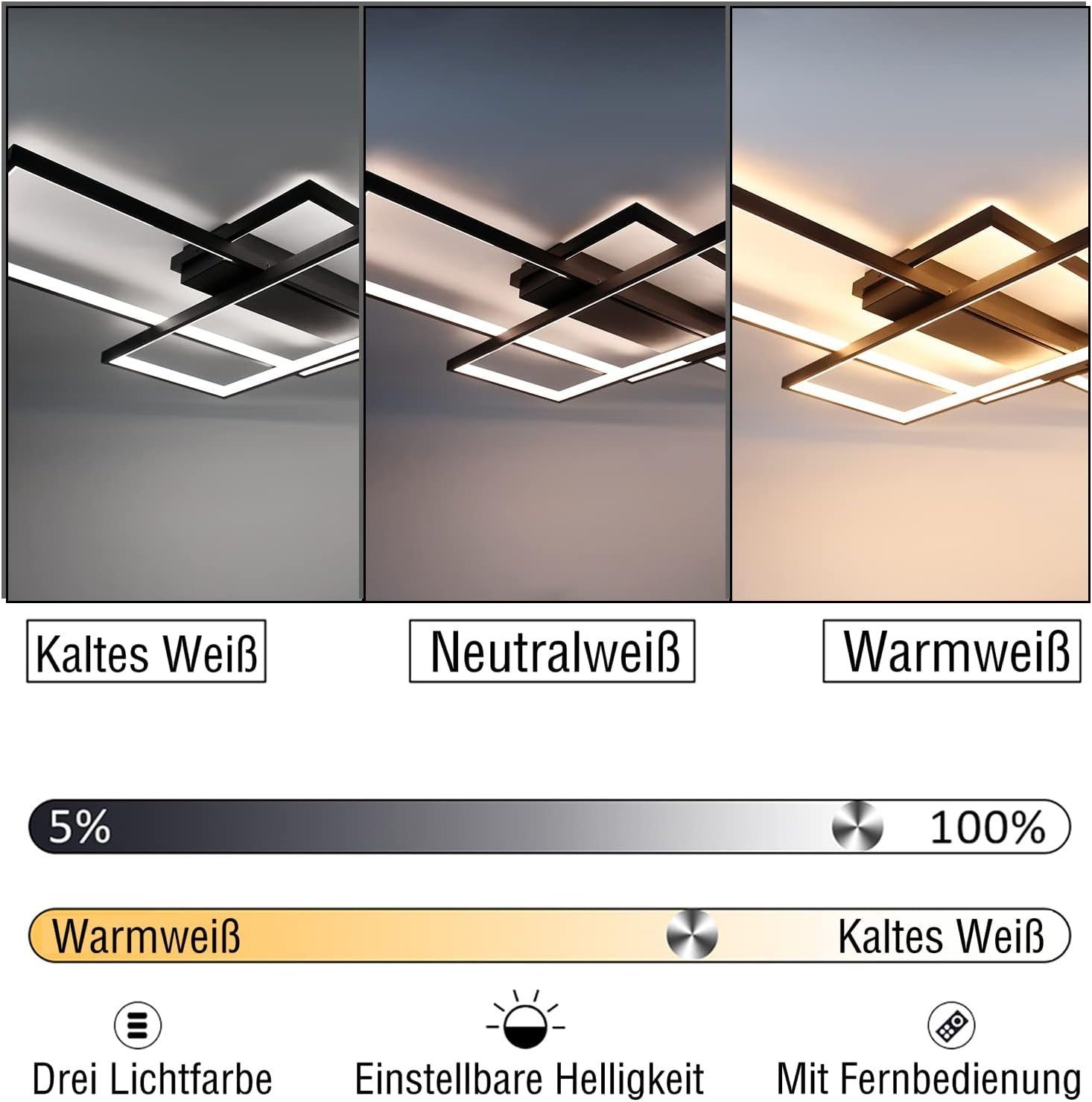 NETTLIFE Himmennettävä Kattovalaisin, 100x70x8cm, 3 Neliönmuotoista Modernia Mustaa LED-kattovalaisinta Kaukosäätimellä, 88W Akryylinen Kattovalaisin Valaistus