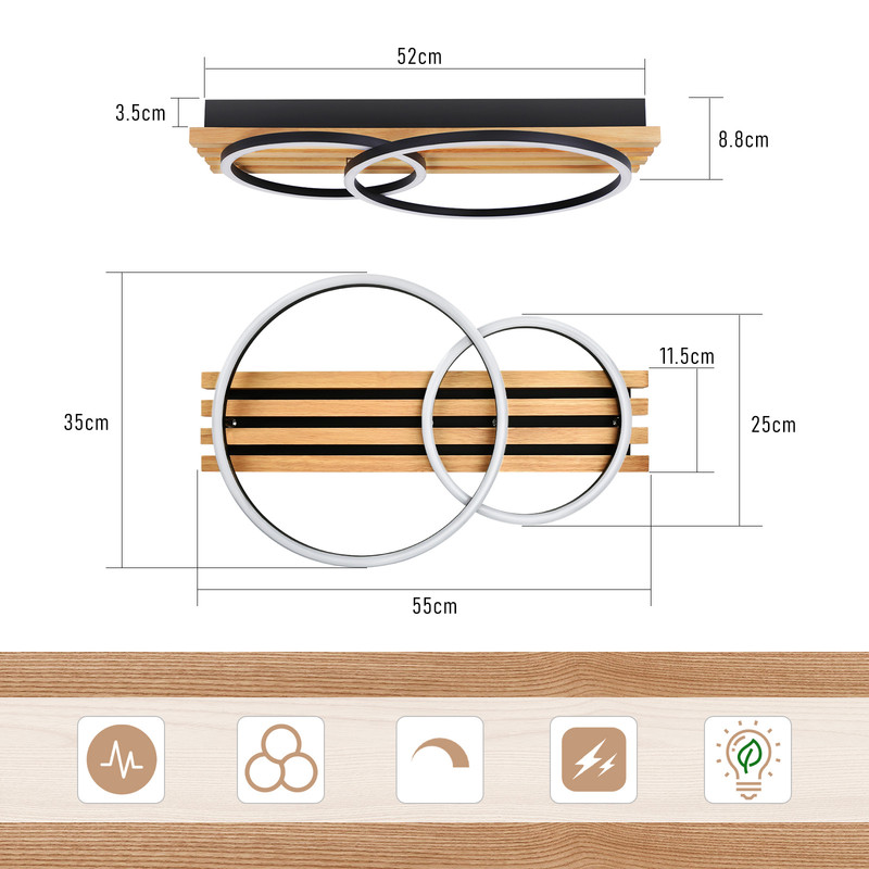 Energiansäästöinen kattovalaisin: Gbly-puisen kattovalaisimen teho on 36 W ja lampun halkaisija 55 cm. Se tarjoaa erittäin kirkasta valoa ja kattaa 15–30 m²:n alueen. Perinteisiin lamppuihin verrattuna se auttaa säätämään yli 90 % energiakuluissa.