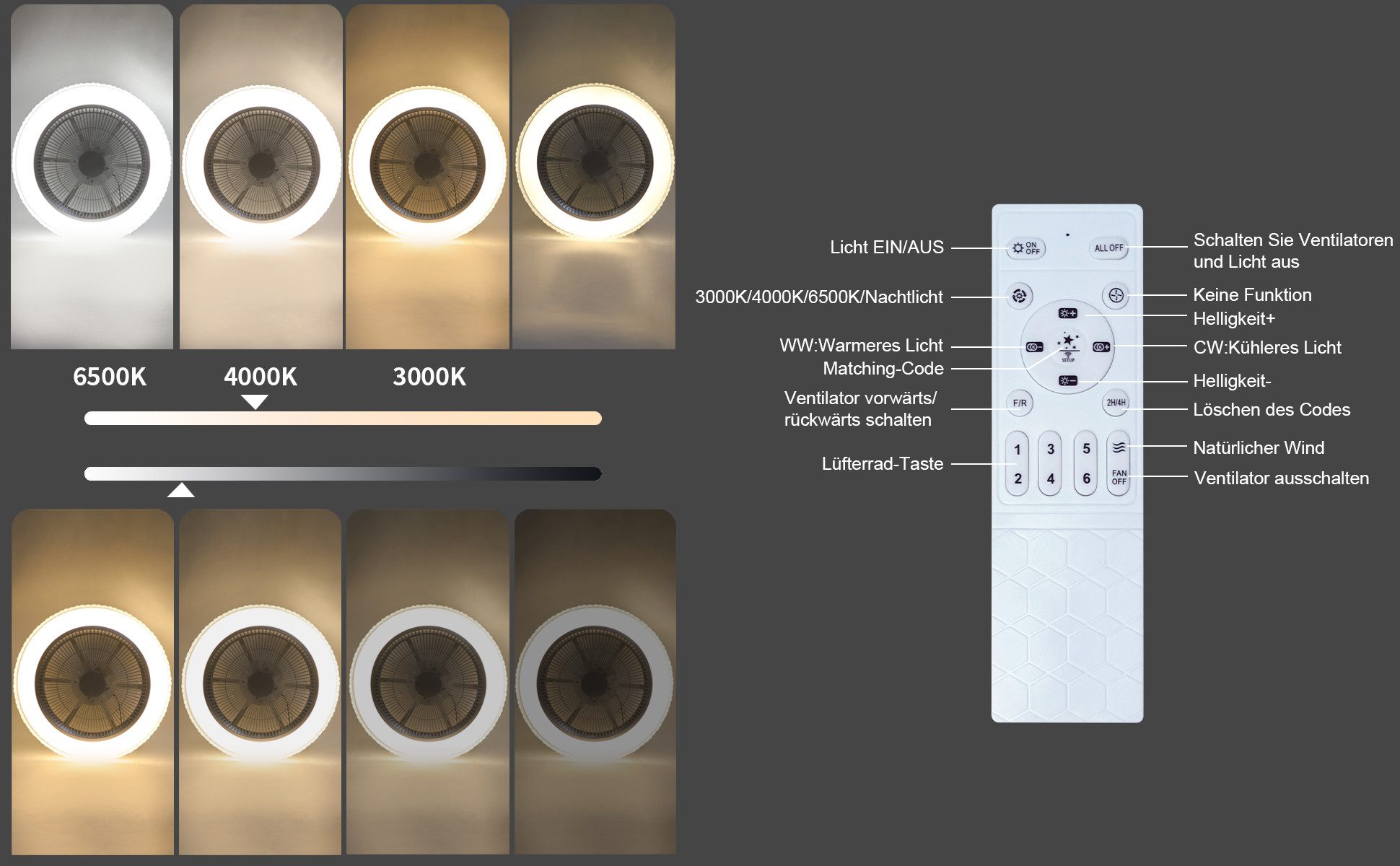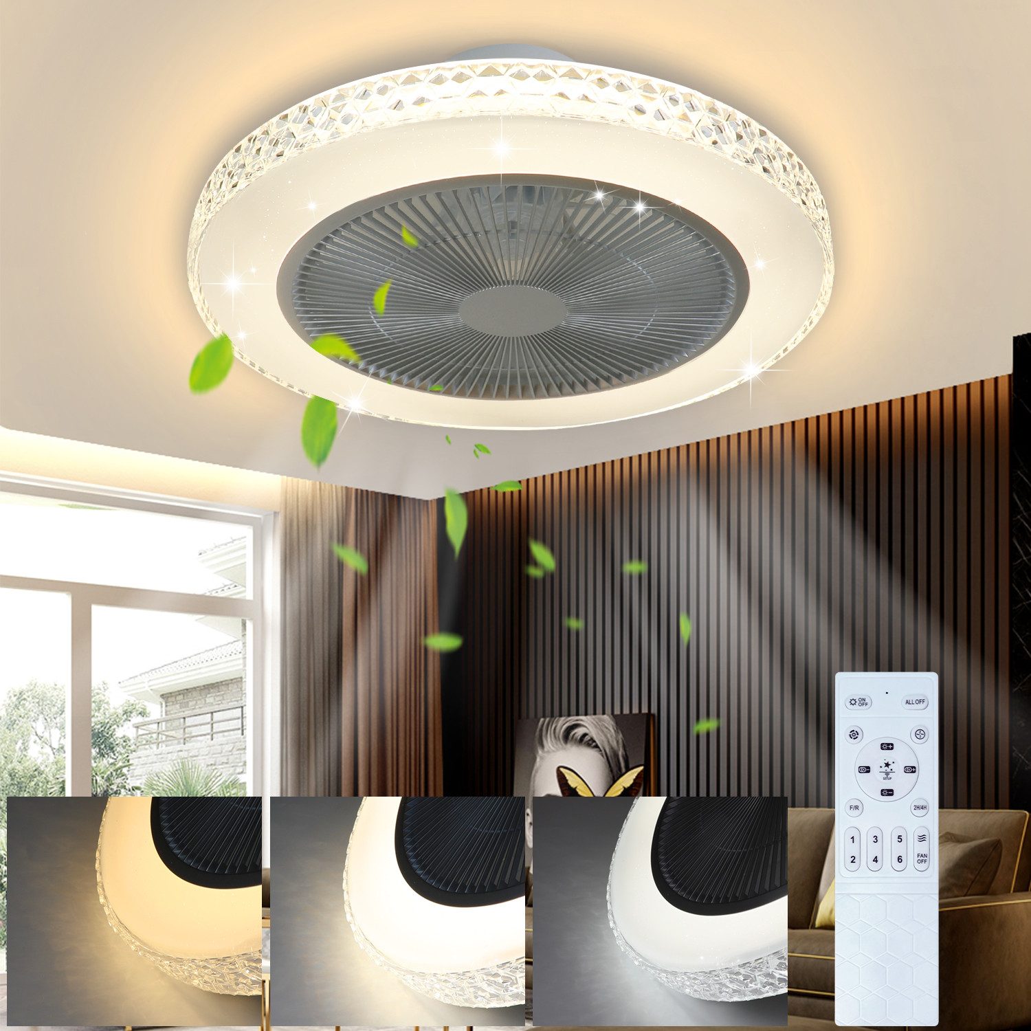 Himmennettävä: Kattotuulettimen valaisinta ympäröivät tasaisesti jakautuneet kristallikoristeet, ja kun se on päällä, valo taittuu kauniisti kattokristallien läpi. Alaspäin suuntautuva valopinta on tähdenmuotoinen, mikä luo tähtitaivaan tunnelman valaistuna. Kattovalaisimen kirkkautta (5–100 %) sekä lämmintä valkoista ja kylmää valkoista valoa (3000 K–6500 K) voidaan säätää kaukosäätimellä. Tuulen nopeus + ajastin: Säädä kattotuulettimen tuulen nopeutta kaukosäätimellä (6 tasoa). Tuulettimen käyntiaikaa voidaan säätää kaukosäätimellä, ja se asetetaan 2 tunnin välein. Energiansäästö + hiljainen: Verrattuna erilliseen tuulettimeen ja valaisimeen, kattovalaisin tuulettimella säästää energiaa ja virtaa käyttämällä yhtä laitetta molempiin toimintoihin. Ilmastointia tarvitaan harvemmin, mikä säästää energiaa ja pienentää ympäristöjalanjälkeä. Tuuletinvalo on erittäin hiljainen toimiessaan eikä pidä melua nukkuessa. Koko ja materiaali: koko 48,5 * 48,5 * 20, kattovalaisimen teho: 38W, tuulettimen teho: 11W, valovirta: 1680LM, säteilyalue: 10-15m². Siinä on muovinen lampunvarjostin + ABS-runko + ABS-tuulettimen siipi + kuparimoottori, tukeva ja kestävä, ja valo on pehmeä eikä häikäise. Kattotuuletin käy hiljaisemmin. LED-valonlähde, energiansäästö ja sähkön säästö. Keskimääräinen käyttöikä on 30 000 tuntia. Soveltuva valaistuskohtaus: yksinkertainen ja muodikas muoto, sopii erittäin hyvin olohuoneeseen, makuuhuoneeseen, lastenhuoneeseen, työhuoneeseen, käytävään ja muihin paikkoihin. Helppo asentaa ja helppo puhdistaa.