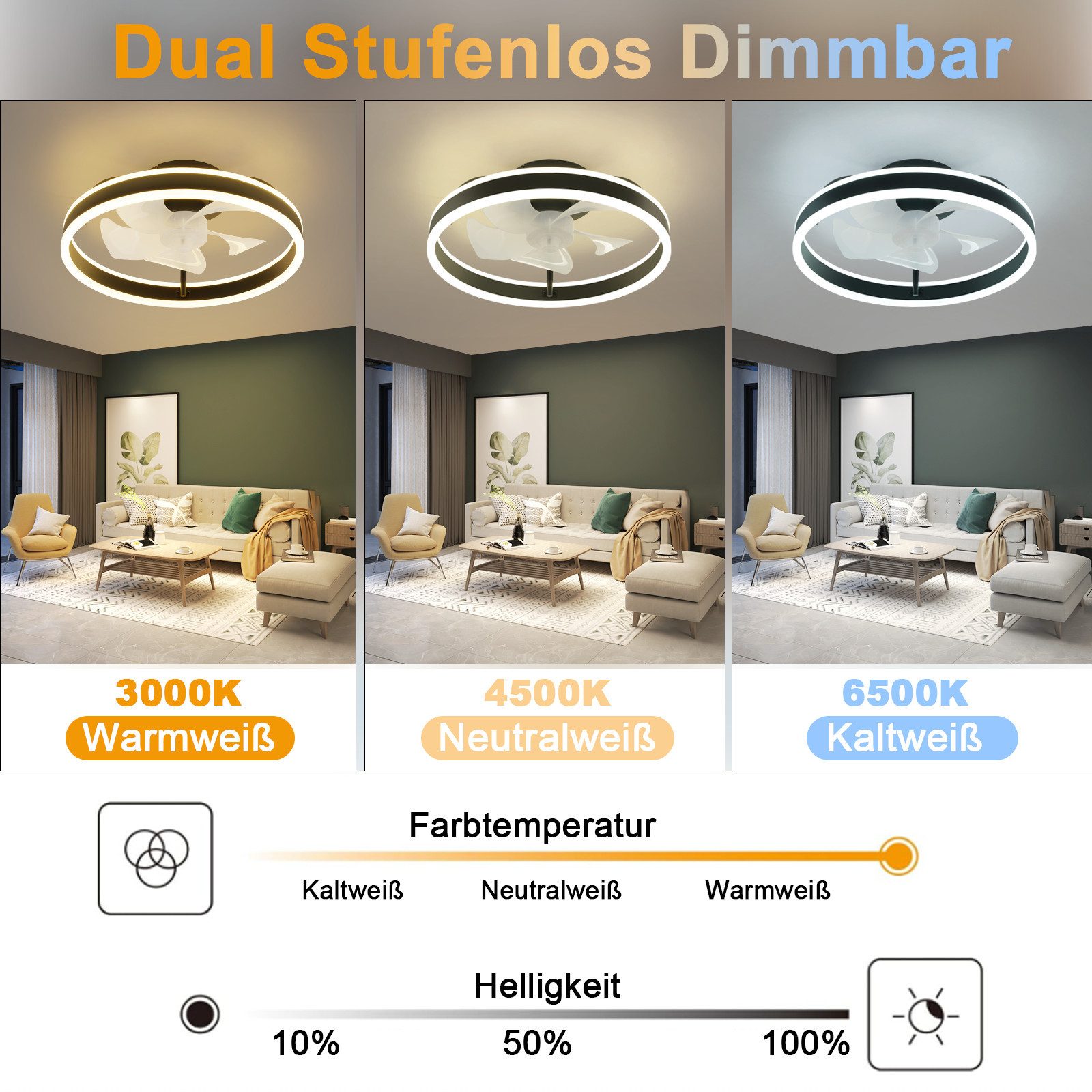 Joustava kirkkauden ja tuulettimen nopeuden säätö:Kattotuulettimessa on CCT-portaaton himmennys, ja värilämpötilaa voidaan säätää vapaasti välillä 3000–6500 K erilaisten valaistustarpeiden täyttämiseksi. Tuulettimessa on kuusi nopeusasetusta, joten voit helposti valita nopeuden henkilökohtaisten mieltymystesi ja ympäristön tarpeiden mukaan.
