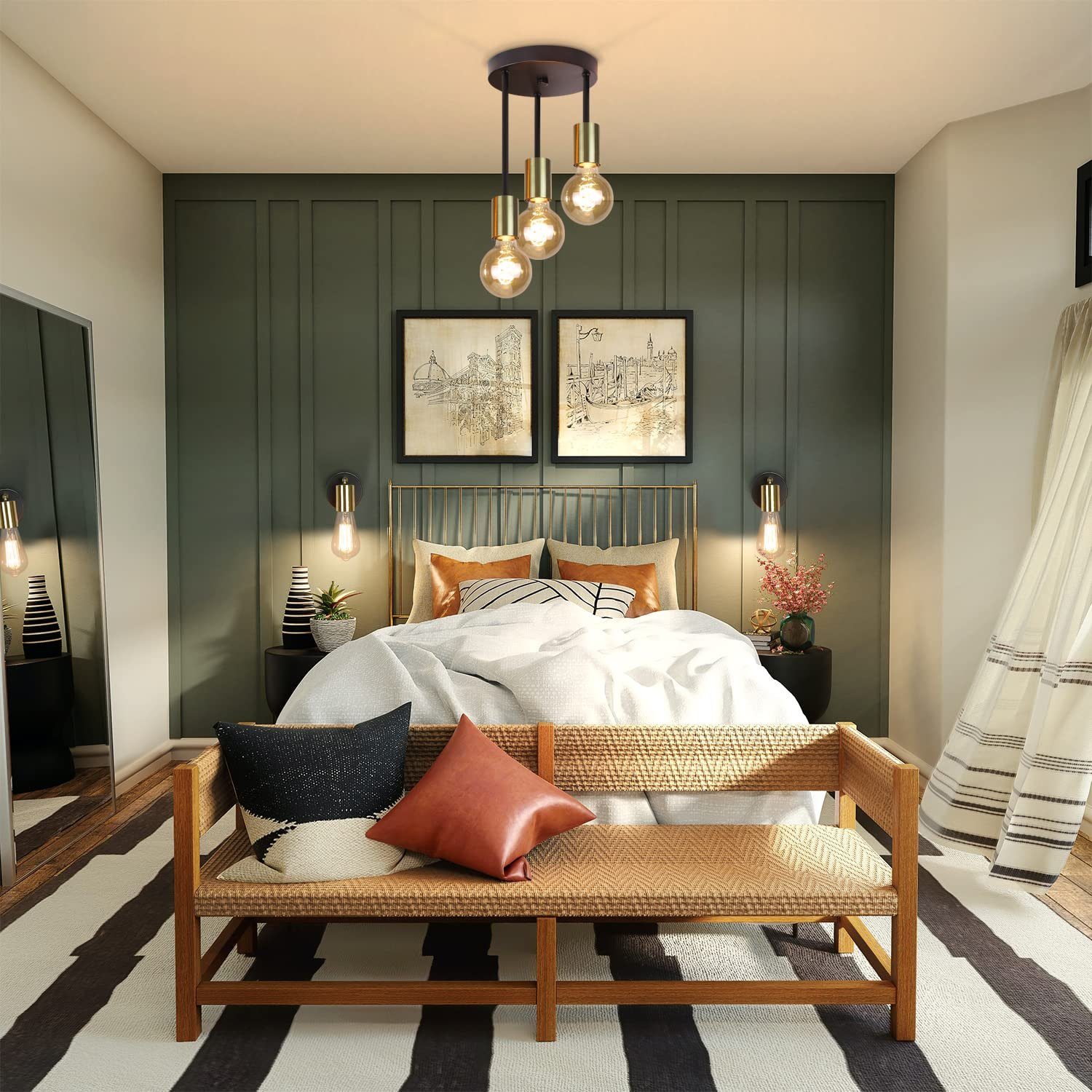 Joustava ja käytännöllinen: Tässä kattovalaisimessa on kolme eripituista kohdevaloa, jotka eivät ainoastaan luo hierarkkista ulkonäköä, vaan myös rikastavat valaistusaluettasi. Kullanvärinen metallikehys sopii myös mustaan kattokupoliin. Jos pidät vintage-väreistä, ne näyttävät erityisen kauniilta Edison-lamppujen kanssa. (Lamput eivät sisälly toimitukseen)