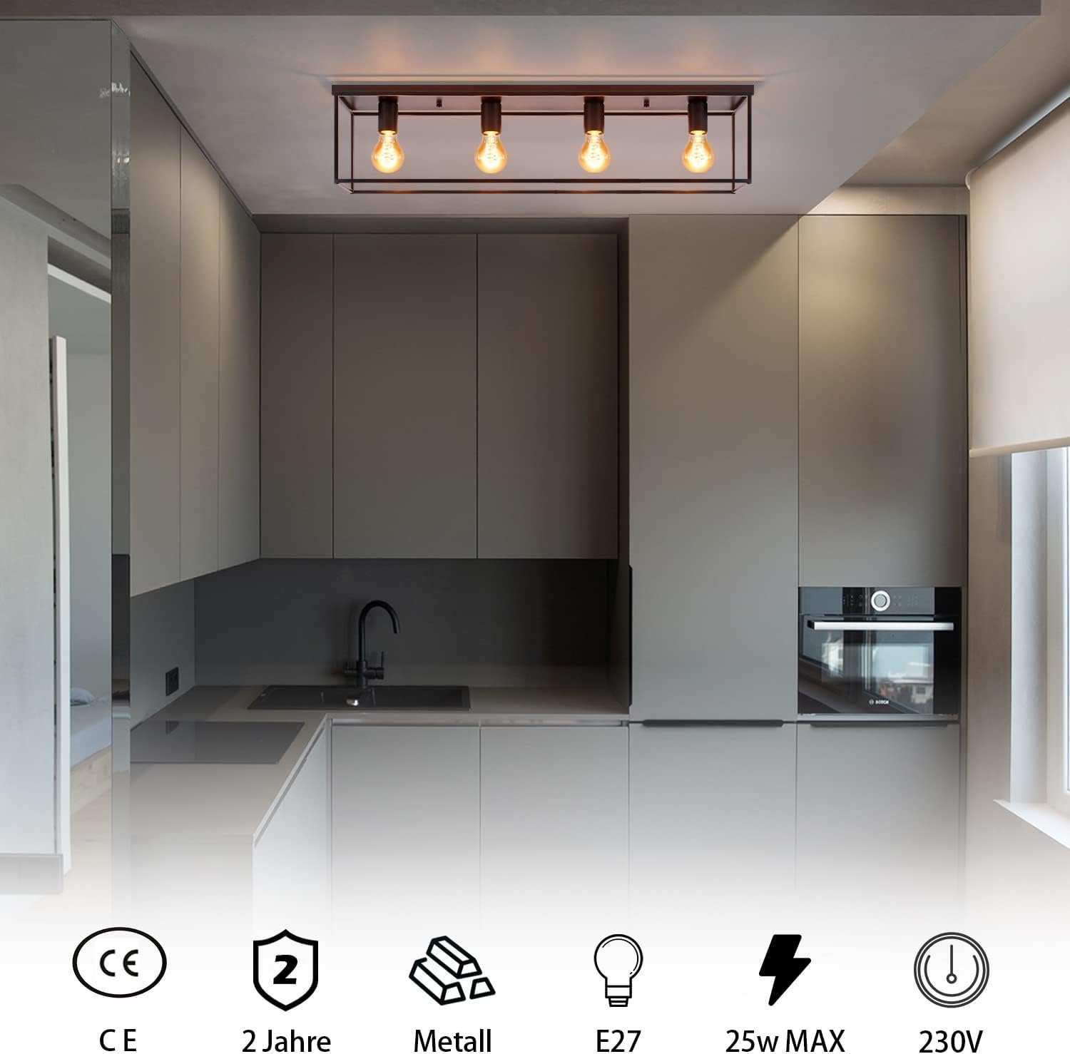 E27-kanta: Vintage-kattovalaisimessa on E27-kanta ja se sopii tavallisille E27-polttimoille (enintään 40 W). Suosittelemme kirkkaita tai kultaisia polttimoita täydentämään vintage-ilmettä. Polttimot eivät sisälly toimitukseen.