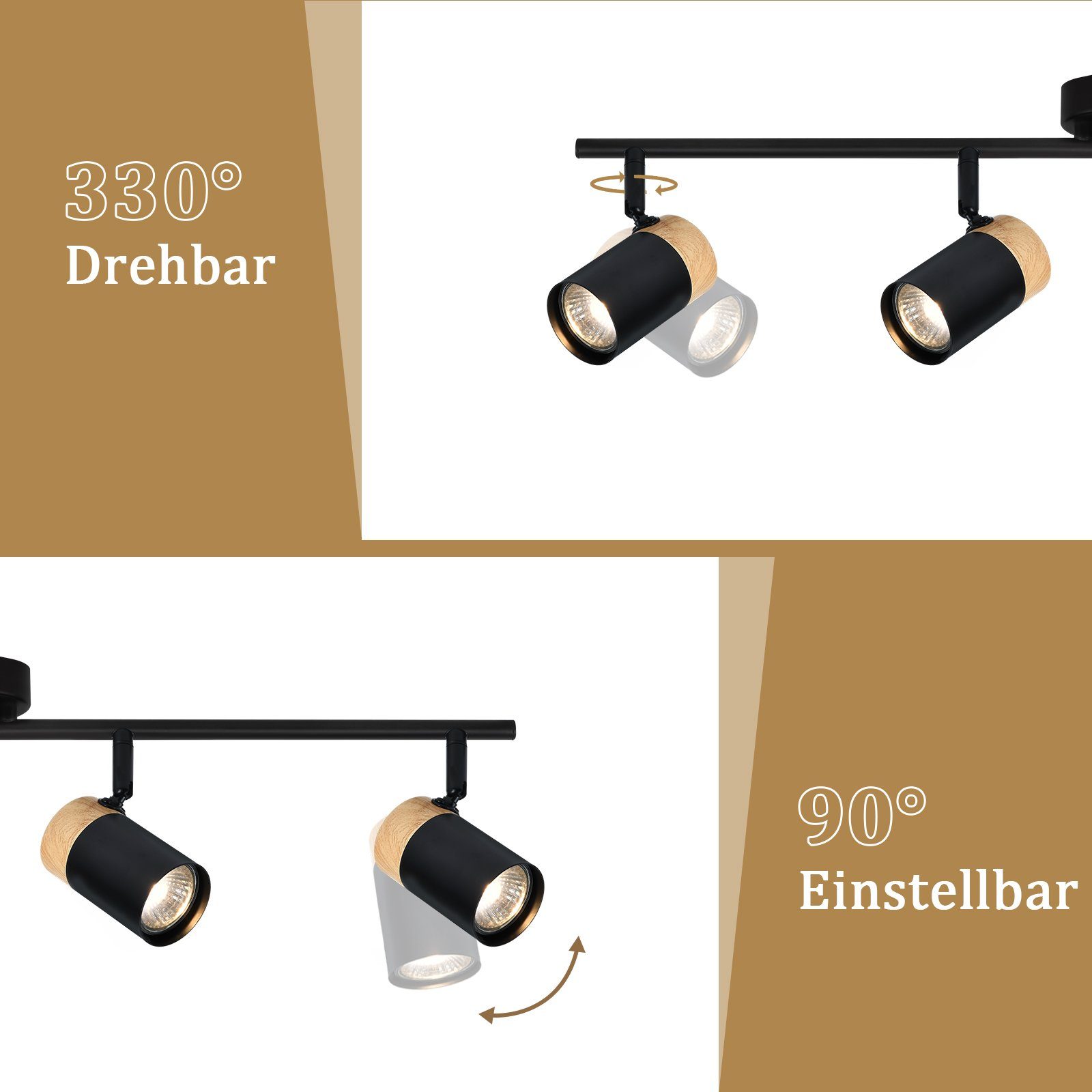 Retro Design: Vintage-olohuoneen kattovalaisin on valmistettu puusta ja metallista, mikä paitsi valaisee myös korostaa olohuoneen kauneutta ainutlaatuisella ulkonäöllään ja lämpimällä tunnelmallaan. Se sopii erilaisiin sisustustyyleihin ja on ihanteellinen valinta kotiisi. Kääntyvä ja pyörivä: Mustaa kattovalaisinta voidaan säätää vapaasti lampun päätä, ja käyttäjät voivat suunnata valoa eri suuntiin tarpeidensa mukaan ja täyttää eri huoneiden valaistustarpeet. GU10-kanta: Valaisimet sopivat erilaisille GU10-polttimoille, tarjoten erilaisia energia- ja värivaihtoehtoja, kuten valkoista valoa, lämmintä valoa, neutraalia valoa ja RGB:tä, joten voit valita sopivimman valaistusvaikutuksen eri ympäristöjen ja tarpeiden mukaan. Helppo asentaa: Puinen kattovalaisin on yksinkertainen ja käytännöllinen, helppo asentaa ja käyttää. Kolmen valon kattovalaisimen mukana toimitetaan kätevät asennustarvikkeet ja ohjeet, ja käyttäjien tarvitsee vain muutaman yksinkertaisen vaiheen kiinnittää kohdevalaisin seinään tai kattoon. Laaja valikoima sovelluksia: Musta metallinen kattovalaisin sopii erilaisiin sisätiloihin, kuten olohuoneisiin, makuuhuoneisiin, ravintoloihin, studioihin jne. Ne voivat toimia pää- tai lisävalaistuksena luoden mukavan ja lämpimän elinympäristön.