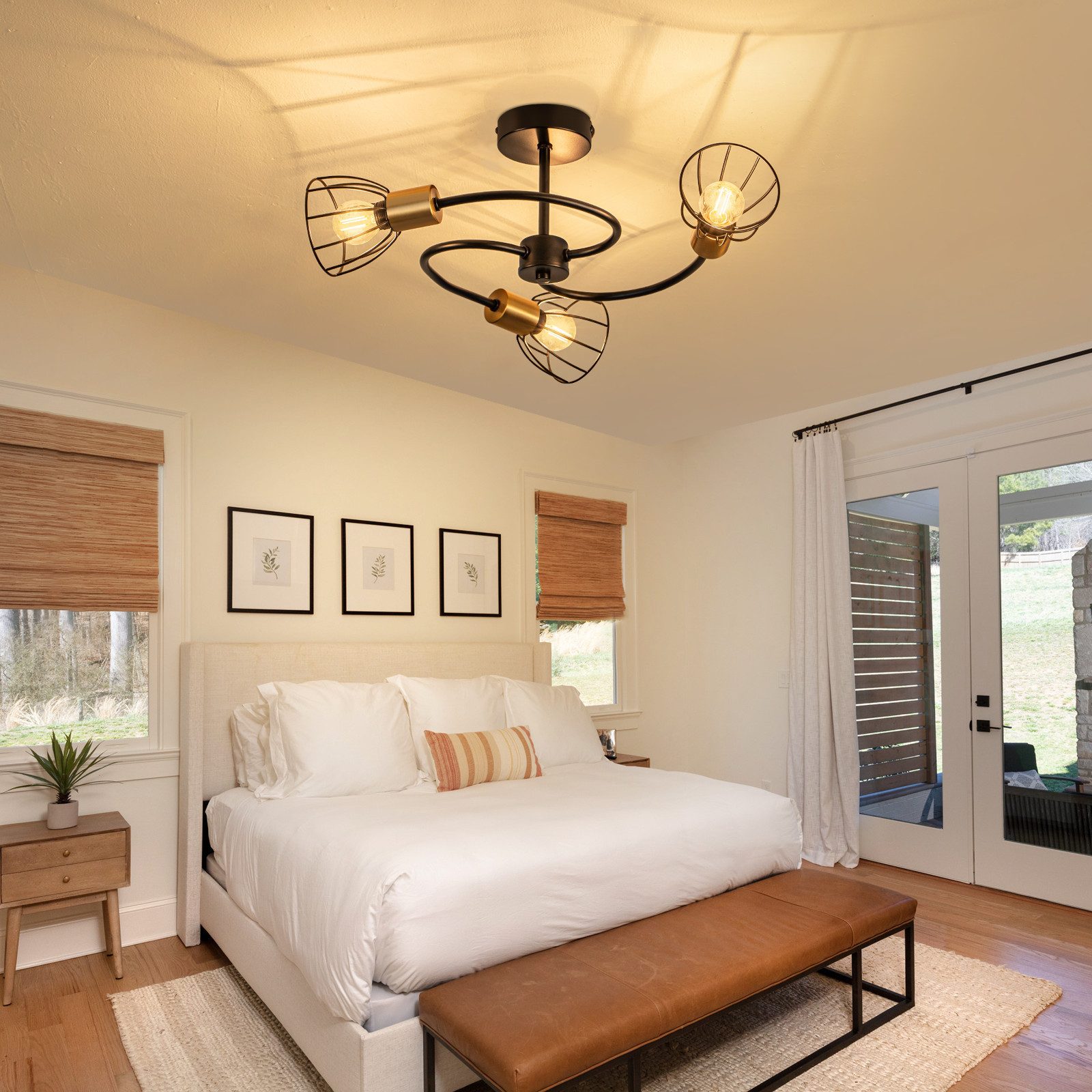 Materiaali: Tämä musta kattovalaisin on valmistettu raudasta ja on pääosin musta, kultaisella jalustalla ja mustalla metalliverkkovarjostimella. Se yhdistää teollisen tyylin hillittyyn ylellisyyteen luoden hienostuneen tunnelman.
