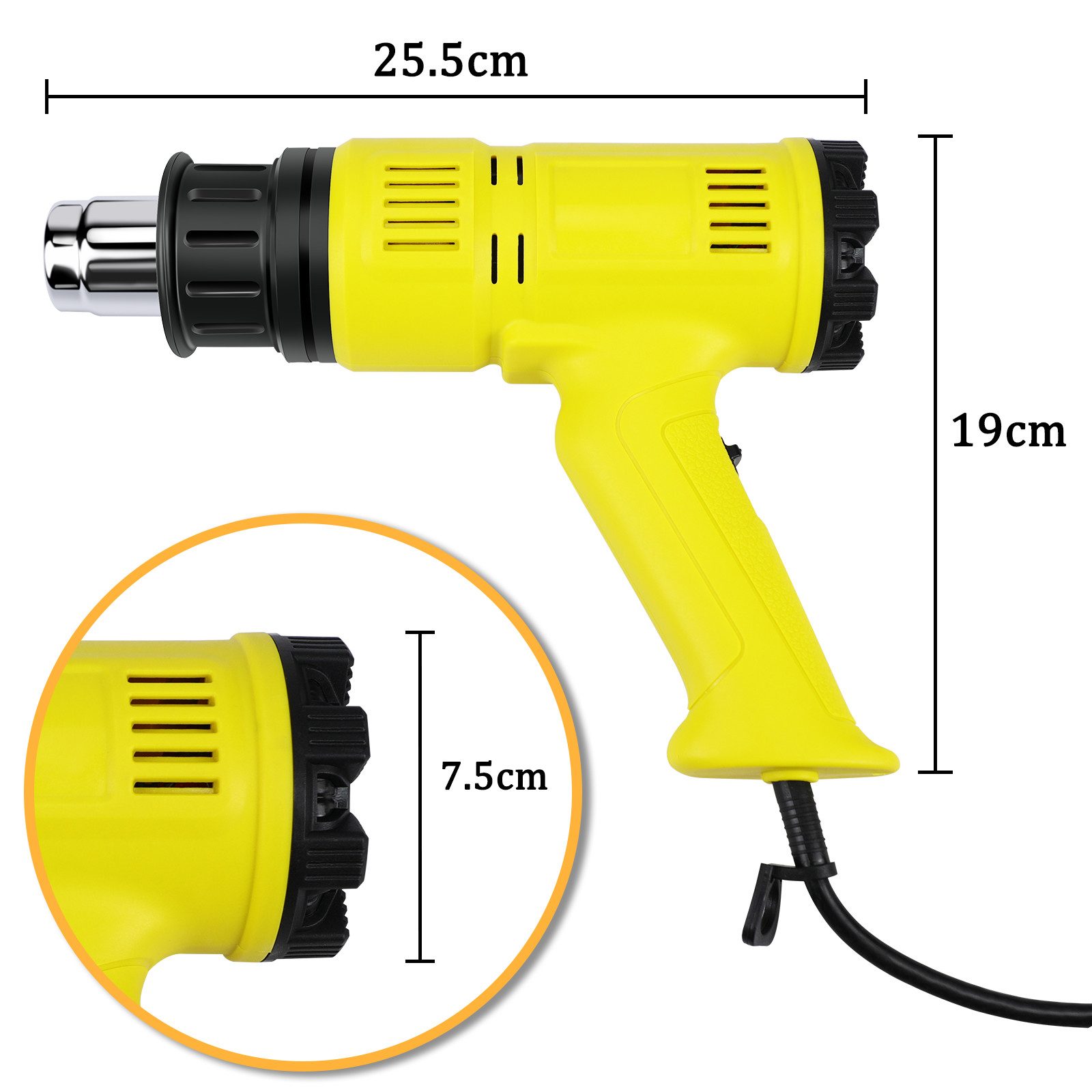 Korkealaatuiset materiaalit: ABS-muovi, lämmönkestävä nailon/ruostumaton teräs takaavat kuumailmapistoolin lujuuden/pitkäikäisyyden jopa tuntikausien käytön jälkeen korkeissa lämpötiloissa.