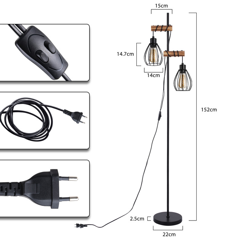 NETTLIFE-lattiavalaisin olohuoneeseen, musta lattiavalaisin: teollinen metallinen puinen lattiavalaisin e27 2-lamppuinen lattiavalaisin häkkivarjostimella 152 cm (ilman lamppua)