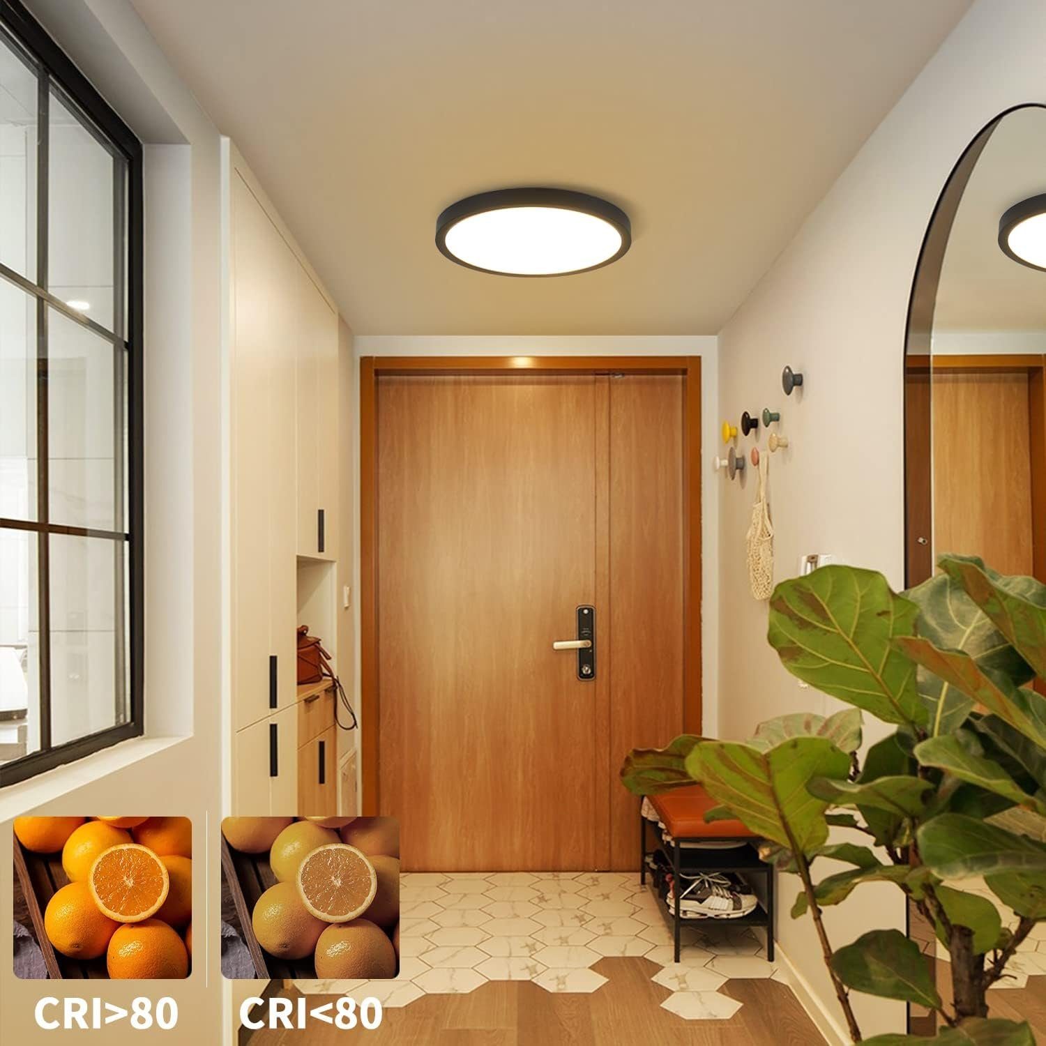 Tiivis rakenne: Tämä litteä kattovalaisin on IP44-vesitiivis ja siinä on tiivis, integroitu rakenne, mikä säästää lampunvarjostimen puhdistamisen vaivan. Se suojaa pölyltä ja lentäviltä hyönteisiltä. Se on ihanteellinen asennettavaksi kosteisiin tiloihin.