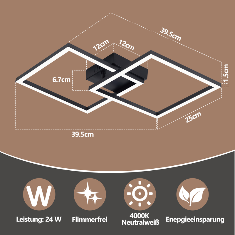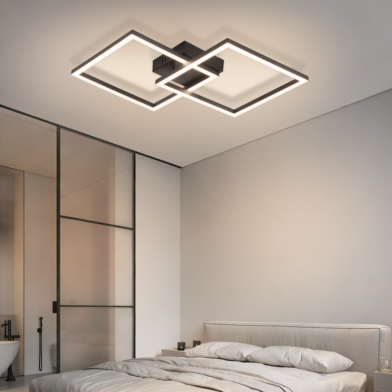 Säädettävä Design: Tämä LED-kattovalaisin koostuu kahdesta neliömäisestä valoelementistä, joista toista voidaan kääntää. Voit muokata sen ulkonäköä henkilökohtaisten mieltymystesi mukaan ja luoda näin olohuoneeseesi, makuuhuoneeseesi tai muihin tiloihin ainutlaatuisen, persoonallisen tyylin.