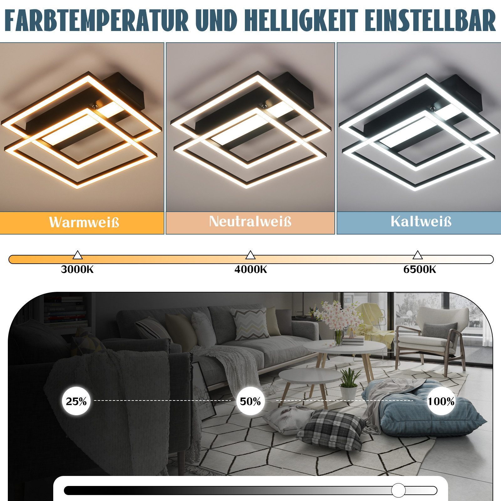 Energiatehokas ja silmiä suojaava:Moderni neliönmuotoinen kattovalo 42W, 5000LM, energiatehokkaampi kuin perinteiset hehkulamput, ja sen käyttöikä on yli 20 000 tuntia. Tämä takaa paremman visuaalisen kokemuksen, kattovalaisimessa on vakaa LED-valonlähde, ei häikäisyä tai välkkymistä, ja voit myös asettaa yövalotilan (10% kirkkaus) suojellaksesi silmiäsi paremmin.