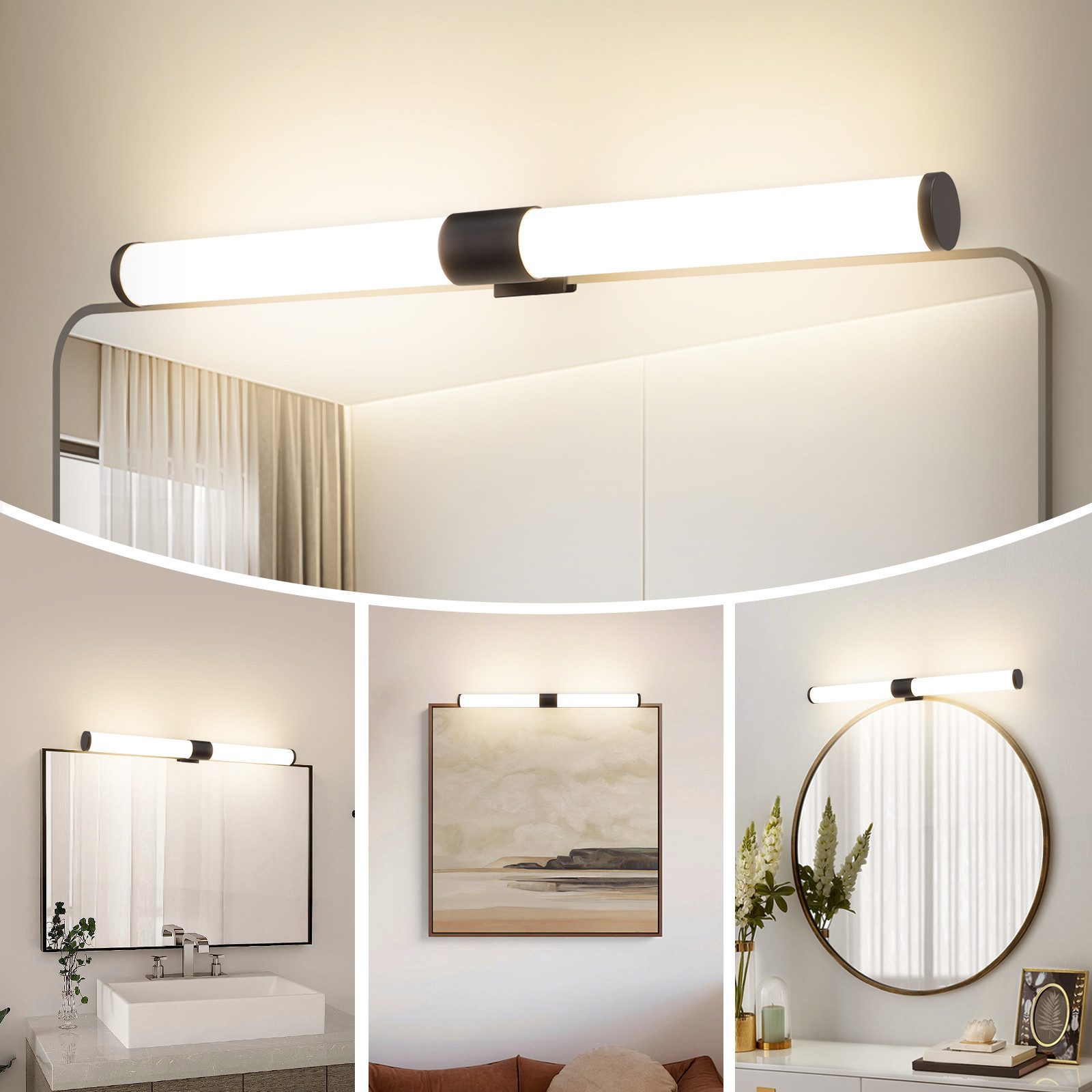 LED-kylpyhuonevalaisin miellyttävällä valolla: Kylpyhuonevalaisin valaistuksella säteilee kirkasta neutraalia valkoista 4000 K:n valoa ilman keltaista tai sinistä sävyä. Pehmeät ja kirkkaat valot säteilevät kaunista hehkua. Täydellinen asennettavaksi peilin yläpuolelle. Neutraali valkoinen valon väri varmistaa myös, että katsoja istuu oikeassa valossa ja silmäsi ovat suojassa, samalla kun tunnet olosi mukavaksi meikatessasi, parranajossa ja hoitaessasi päivittäistä henkilökohtaista hoitoa.