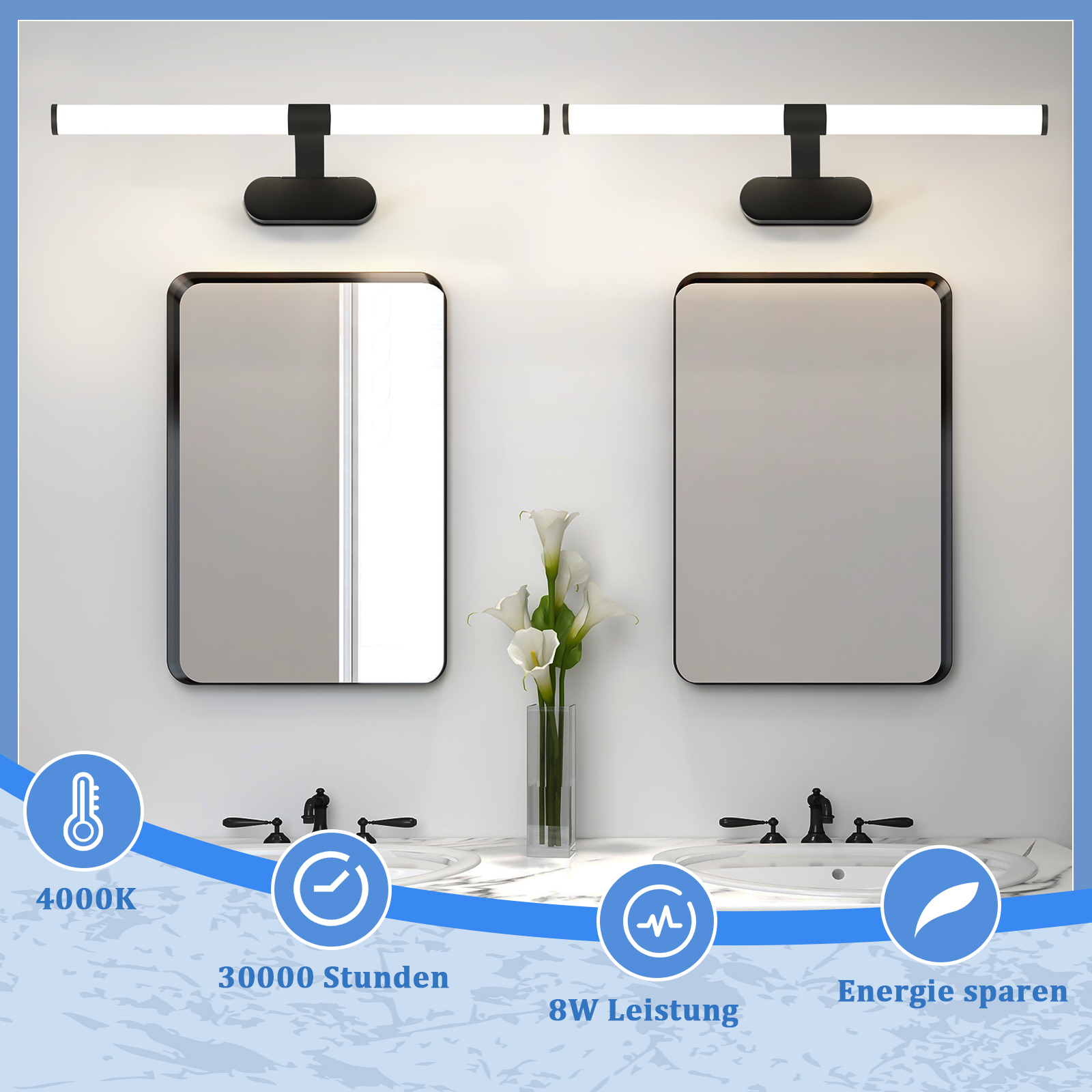 Vedenpitävä IP44:Tätä kylpyhuoneen seinävalaisinta voidaan käyttää käytävällä ja olohuoneessa sekä kylpyhuoneessa, koska se on hyvin suojattu kosteudelta IP44-suojausluokituksen ansiosta. Peilivalaisimen liitäntäkotelo on peitetty tiiviillä kannella, mikä varmistaa piirin turvallisuuden ja estää vieraiden esineiden pääsyn sisään. Silmien suojaus:Tämä LED-peilivalaisin on ihanteellinen peilin valaisuun - välkkymättömän ja häikäisemättömän peilivalon ansiosta se on klassinen kylpyhuonevalaisin, joka näyttää hyvältä peilin yläpuolella ja ennen kaikkea tarjoaa hyvän valon, joka loistaa häikäisemättä. Neutraali valkoinen valoväri on myös ihanteellinen oikean valaistuksen saavuttamiseksi katsojalle. Helppo asennus:Tämä LED-kylpyhuoneen peilin etuvalaisin tarjoaa kaksi helppoa asennustapaa. Voit asentaa lampun suoraan seinälle tai käyttää sitä tavallisena seinävalaisimena. Tämä tekee siitä sopivan kaikenmuotoisille ja -tyyppisille peileille. Laaja valikoima sovelluksia: Suora muoto ja kiiltävä musta pinta antavat peilivalaisimelle energiansäästävillä LEDeillä erittäin modernin ilmeen. Tämä luo tasaisimman mahdollisen valon kauniiseen peilivalaistukseen, jota löytyy useimmista kylpyhuoneista ja kosteista tiloista, esim. kylpyhuone, autotalli, eteinen, keittiö ja kellari. Turvallinen ja luotettava:Tämä LED-valoputki käyttää täyttä PC-kotelomateriaalia. LED-seinävalaisimella on CE/ROHS-sertifikaatti, ja LEDin käyttöikä on 30 000 tuntia kosteissa tiloissa.