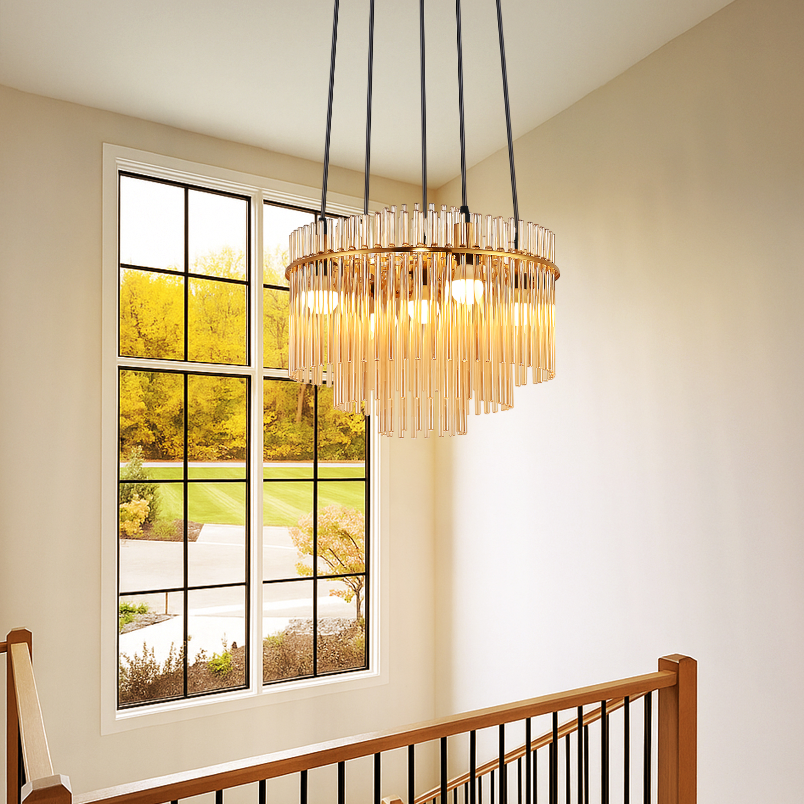 Korkealaatuiset materiaalit: Tässä 5-liekkisessä riippuvalaisimessa on käytetty korkealaatuista metallia rungossa ja korkeussäädettävää PVC-ripustusnarua. Se on yhdistetty meripihkanvärisistä kirkkaista lasiputkista valmistettuun varjostimeen, mikä varmistaa kestävyyden ja pitkäikäisen, elegantin ulkonäön.