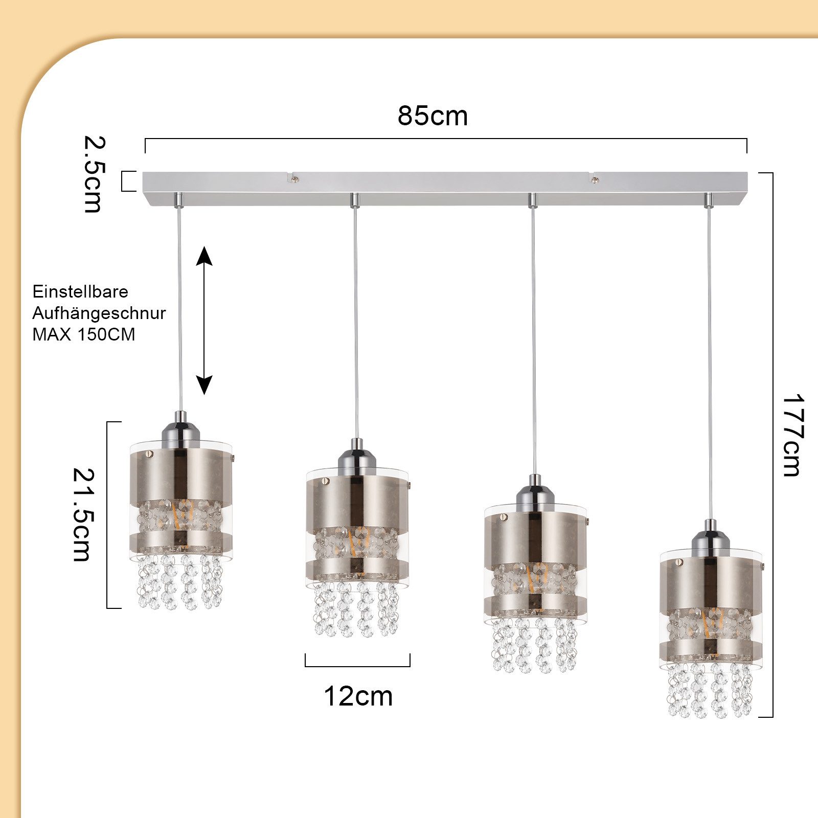 Säädettävä korkeus: Tämä nelivaloinen riippuvalaisin tarjoaa joustavan korkeussäädön kätevällä johdolla. Sen pituutta voidaan säätää enintään 150 cm:iin, jotta se mukautuu optimaalisesti huoneen korkeuteen ja valaistustarpeisiin. Sen moderni tyyli lisää ripauksen eleganssia sisustukseen ja tekee siitä ihanteellisen erilaisiin käyttötarkoituksiin, kuten makuuhuoneisiin, olohuoneisiin ja eteisiin, joissa tarvitaan lisävalaistusta.