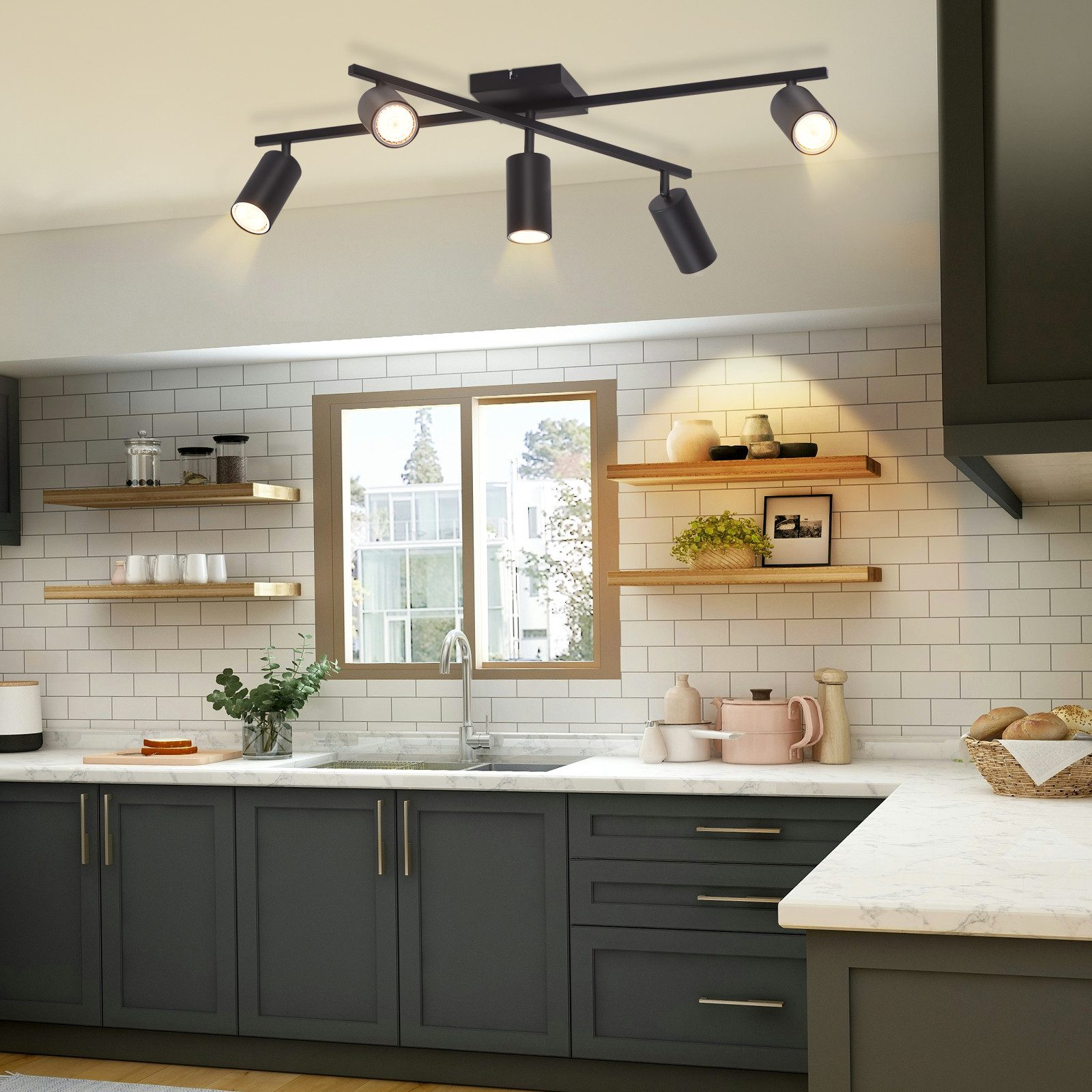 Tuoteparametrit: Materiaali: metalli; Kanta: 5xGU10 (Max. 25W); Tuotteen mitat: Jännite: 230V; Väri: matta musta/matta valkoinen; Toimituksen laajuus: lamput eivät sisälly; Käyttöalueet: makuuhuone, ruokailuhuone, olohuone, hotelli, keittiö, toimisto jne.