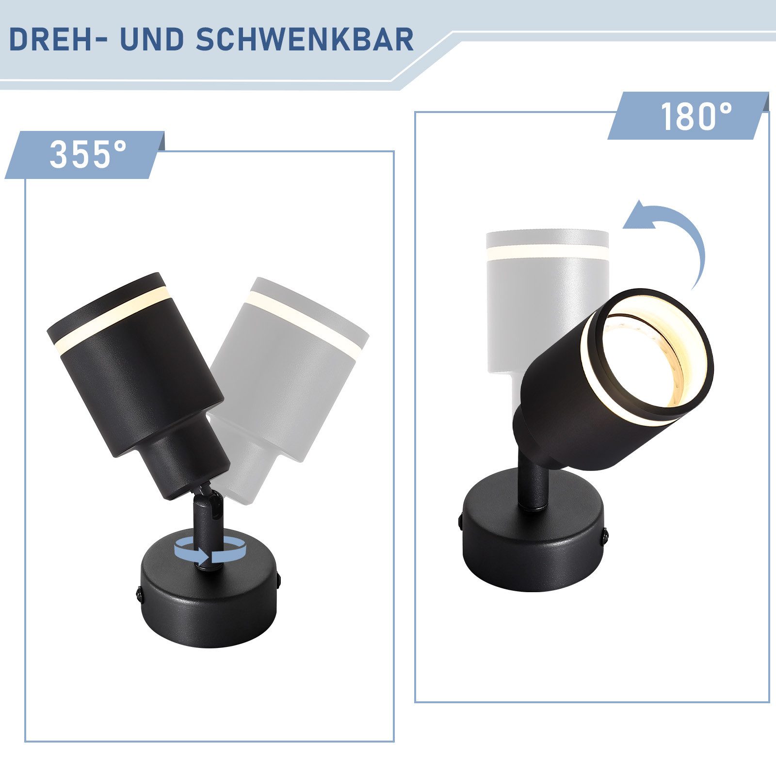 Kääntyvä ja pyörivä: Kattoon asennettuja kohdevalaisimia voidaan säätää 180° ylös ja alas ja pyörittää 355°. Näin voit suunnata valon tarkasti huoneen eri alueille ja mukauttaa sen yksilöllisiin valaistustarpeisiisi luodaksesi mukavan valaistuksen.