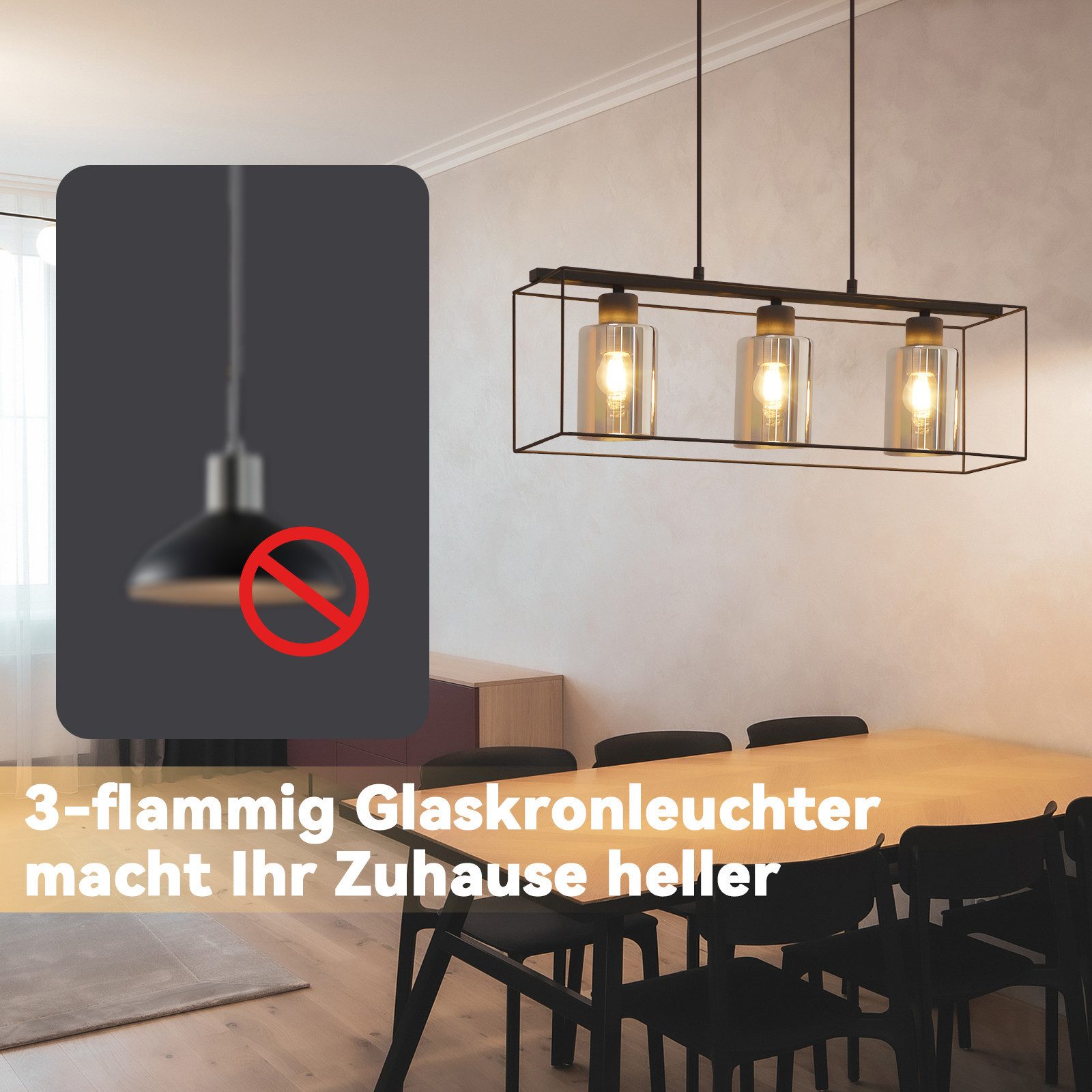 Tukeva ja kestävä: Tämä ruokailuhuoneen riippuvalaisin on valmistettu korkealaatuisesta lasivarjostimesta ja tukevasta rautaisesta riippuvalaisimesta. Lasi antaa valaisimelle elegantin ulkonäön ja muodikkaan kosketuksen, kun taas rautainen riippuvalaisin varmistaa vakauden ja kestävyyden. Asennus on myös helppoa: toimitamme ohjeet ja kaikki asennustarvikkeet, jotta valaisimen asennus olisi nopeaa ja helppoa.