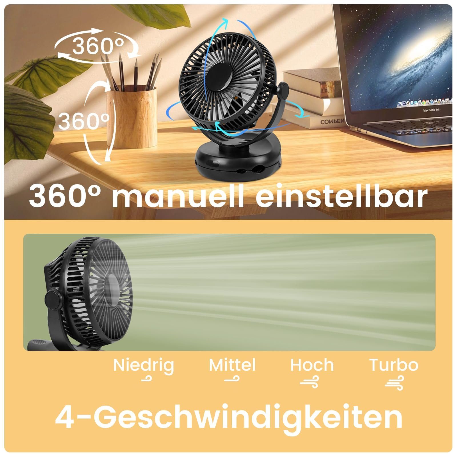 10 000 mAh akku: Pöytätuuletin on varustettu tehokkaalla 10 000 mAh akulla, joka mahdollistaa pitkän käyttöajan yhdellä latauksella. Asetetusta tuulen nopeudesta riippuen akku kestää jatkuvasti 7,5–41 tuntia. Klipsikiinnitteisen tuulettimen mukana tulee myös Type-C-latauskaapeli latausta varten. Tehokas 5-lapainen rakenne: Autotuulettimessamme on 4 eri nopeusasetusta, joten voit valita täydellisen asetuksen mihin tahansa ympäristöön. Innovatiivisen 5-lapaisen rakenteensa ansiosta se varmistaa sujuvan ja hiljaisen toiminnan. Tämä mahdollistaa keskittyneen ilmavirran ja ilman jakautumisen laajalle alueelle maksimaalisen viilennyksen saavuttamiseksi. Monipuolinen LED-valo ja joustava 360° pyöriminen: Kannettava telttatuuletin on varustettu sisäänrakennetulla LED-valolla, joka toimii sekä tuulettimena että retkeilyvalona. Sinulla on siis aina riittävästi valoa, heräätpä yöllä tai leiriydyt luonnossa. Pieni pöytätuuletin voi pyöriä joustavasti 360° säätääksesi ilmavirtaa tarpeen mukaan ja nauttiaksesi raikkaasta tuulahduksesta. Monipuolisuus ja käytännöllisyys: Hiljainen 3-in-1 pöytätuulettimemme tarjoaa monia käyttötarkoituksia korkealaatuisen integroidun jalustansa ja kokoontaitettavan koukunsa ansiosta. Voit helposti asettaa sen pöydälle tai käyttää sitä eri tilanteissa, kuten autossa, lastenrattaissa, sängyssä ja muissa paikoissa. Täydellinen telttoihin, retkeilyyn tai matkustamiseen, se on luotettava kumppanisi pitämään sinut viileänä kuumina kesäpäivinä. Tuotetiedot: Tuotteemme mitat ovat 16 x 12 x 19,3 cm, ja siinä on neljä erillistä nopeusasetusta maksimaalisen mukavuuden takaamiseksi. Tuuletin saa virtansa pitkäikäisestä 21700 litiumioniakusta, mikä takaa pitkäkestoisen suorituskyvyn. Kotelo on valmistettu tukevasta ABS+PP-materiaalista pitkän käyttöiän takaamiseksi.