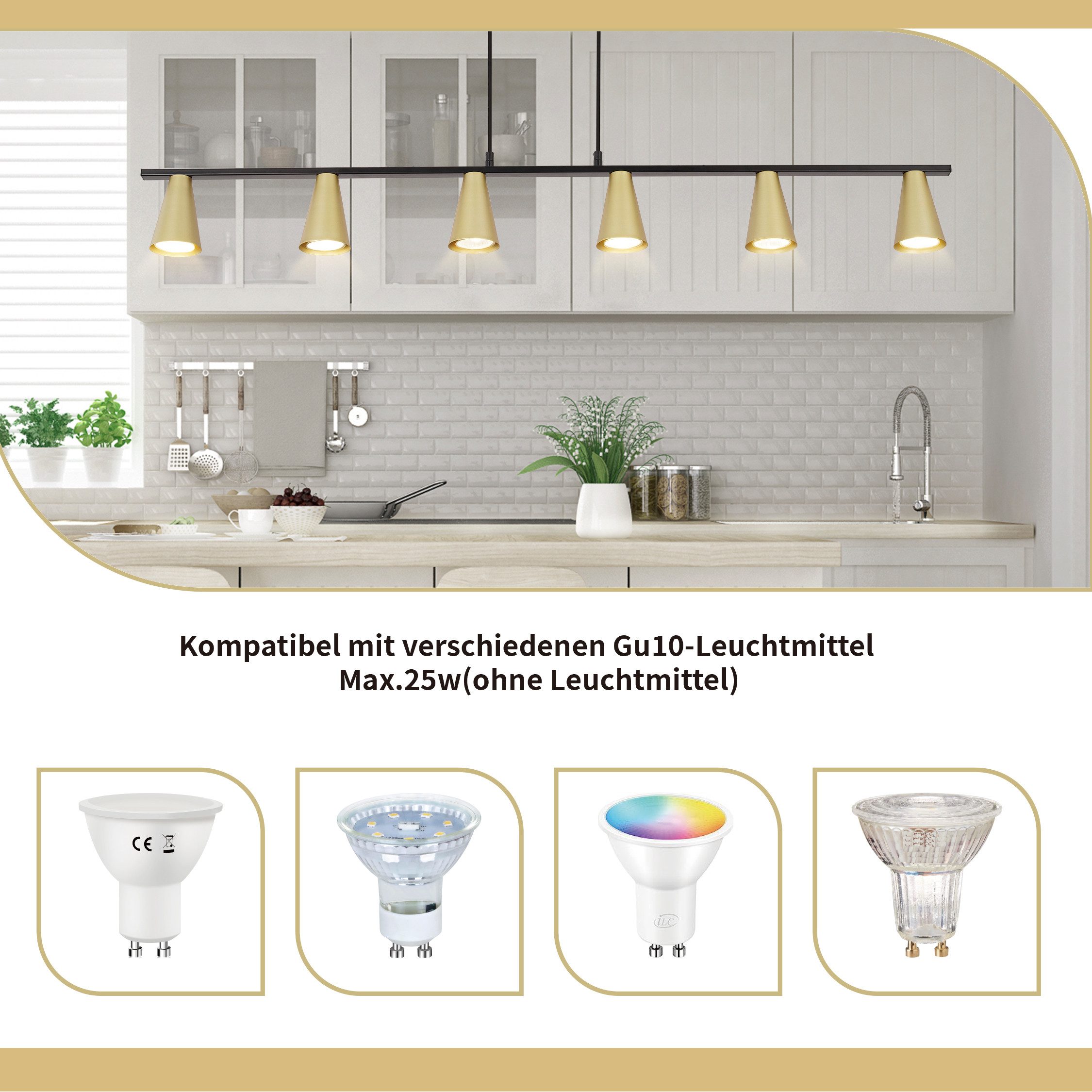 MONIPUOLISET KÄYTTÖKOHTEET: GU10-riippuvalaisin on moderni ja tyylikäs riippuvalaisin. Tyylikkään muotoilunsa ja kultaisen värinsä ansiosta se sopii täydellisesti mihin tahansa sisustukseen ja luo miellyttävän ilmapiirin. Yksi tämän suuren riippuvalaisimen suurimmista eduista on sen monipuolisuus. Se sopii erinomaisesti käytettäväksi olohuoneissa, ruokailuhuoneissa, toimistoissa tai jopa ravintoloissa ja hotelleissa.