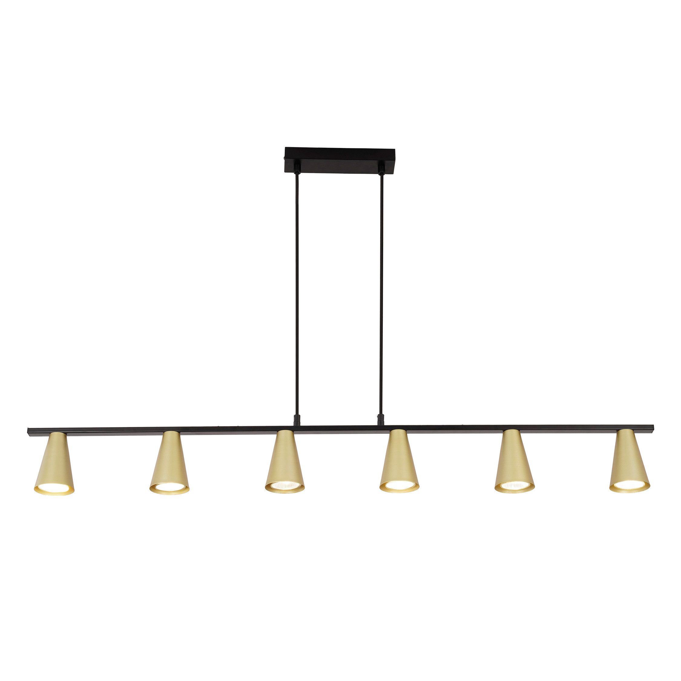 TEKNISET TIEDOT: Materiaali: Metalli; Mitat: Kattokupin koko: 20 x 2,5 cm; Varjostimen korkeus: 11 cm; Varjostimen halkaisija: 7 cm; Ripustus: jopa 150 cm; Väri: musta ja kulta; Kanta: 6x GU10 max. 25W (ei sisälly toimitukseen)