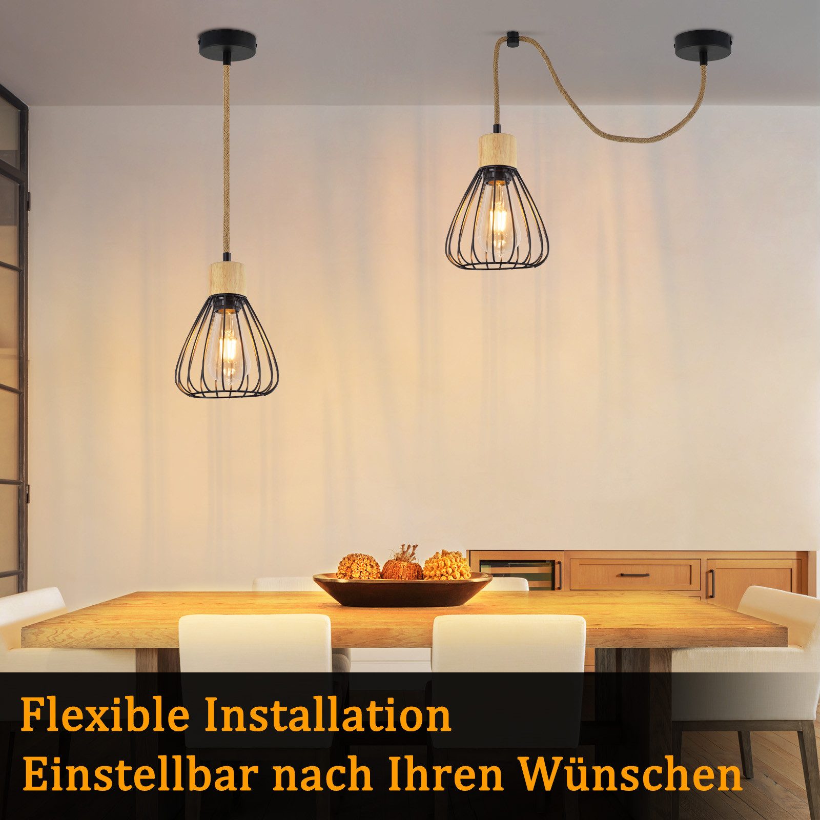 JOUSTAVA ASENNUS: Tämä ruokailuhuoneen valaisin tarjoaa laajan valikoiman yksilöllisiä asennusvaihtoehtoja. Ripustusköyttä voidaan säätää vapaasti haluttuun asentoon – suoraan tai kaarevaan ripustukseen – erilaisten huoneiden tarpeiden mukaan. Tarjoamme myös korkeussäädön, jonka avulla käyttäjä voi helpommin säätää valaisimen ripustuskorkeutta tarpeidensa mukaan.