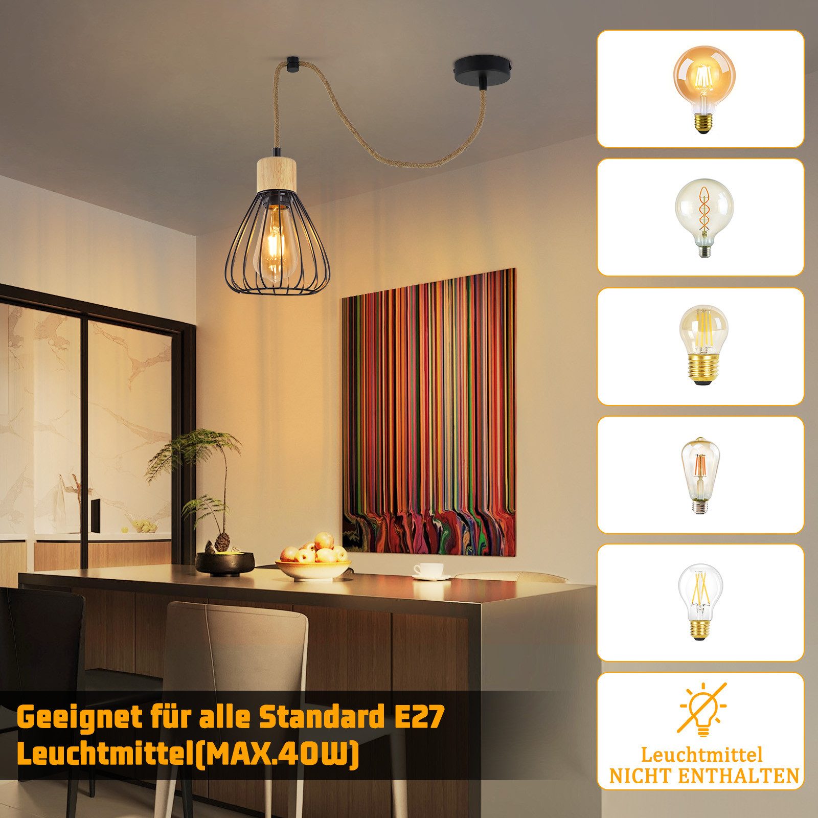 VAKIO E27-KANTA: Tässä ruokailuhuoneen valaisimessa on vakio-E27-kanta, joka tukee enintään 40 W:n tehoa. Tämä tarkoittaa, että voit valita lampun, joka tarjoaa tarpeisiisi sopivan kirkkauden – sekä pehmeän että lämpimän valoefektin ja riittävän kirkkautta valaisemaan koko huoneen.