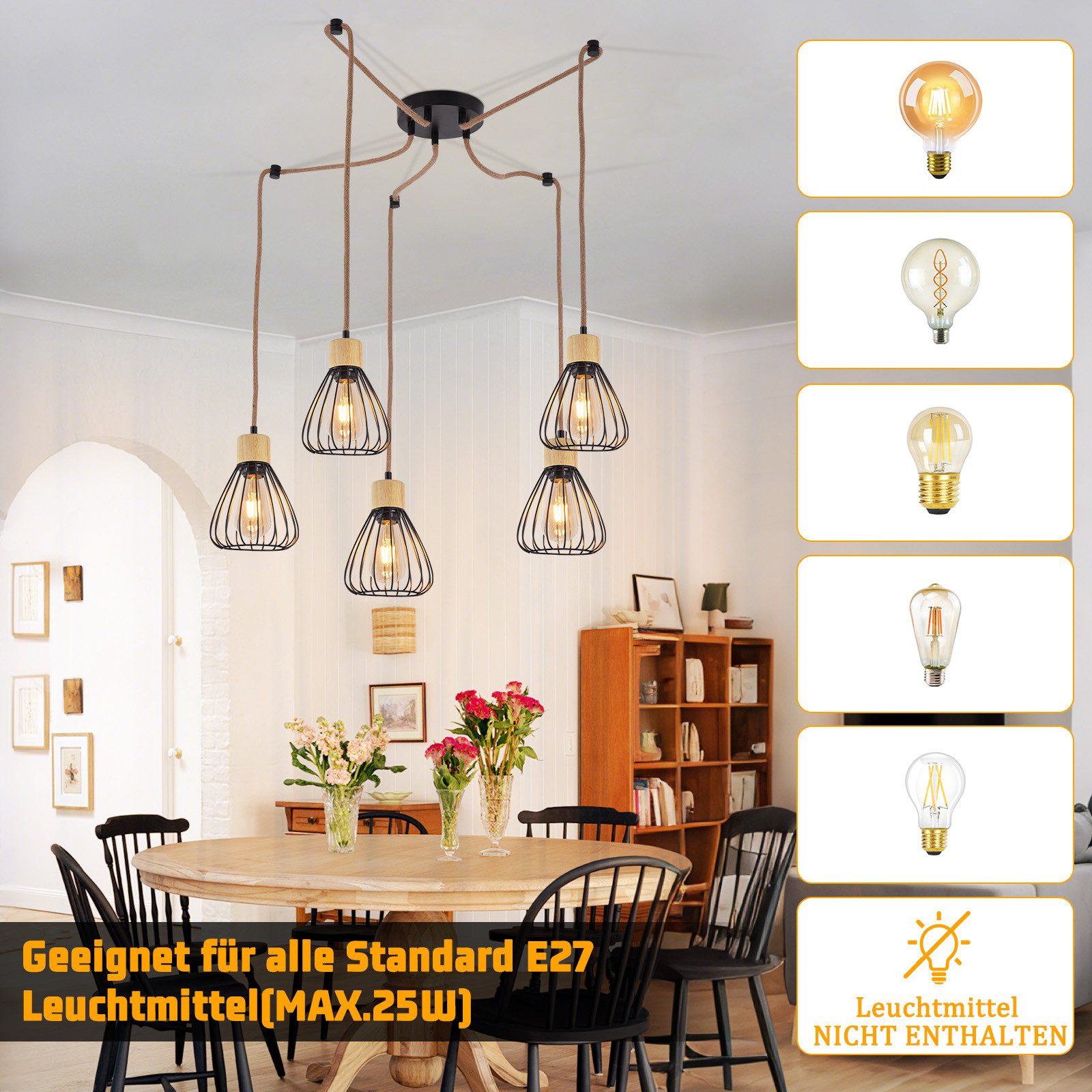 VAKIO E27-KANNAT: Tämä ruokailuhuoneen valaisin on varustettu vakiomallisella E27-kannalla, joka tukee enintään 25 W:n tehoa. Tämä tarkoittaa, että voit valita lampun, joka tarjoaa tarpeisiisi sopivan kirkkauden – sekä pehmeän, lämpimän valoefektin että riittävän kirkkautta valaisemaan koko huoneen.