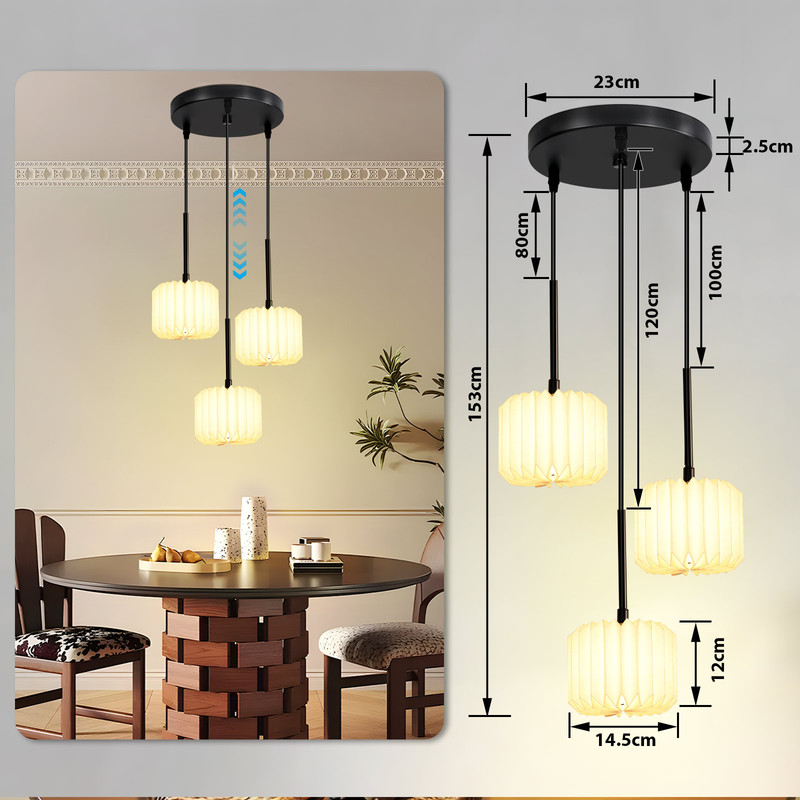 Ainutlaatuinen muotoilu: Tässä riippuvalaisimessa on ainutlaatuinen origami-muotoilu ja innovatiivinen paperivarjostin. Pyöreä metallijalusta antaa koko valaisimelle hienostuneen muotoilun ja tuo kotiisi ripauksen retro-eleganssia. Korkealaatuiset materiaalit: Riippuvalaisimen varjostin on valmistettu korkealaatuisesta paperista, joka on taitettava, särkymätön ja kestävä. Jalusta on valmistettu metallista, ja ohuet lampun johdot on yhdistetty pyöreään metallijalustaan, mikä parantaa lampun vakautta. Musta pinnoite suojaa lamppua ruosteelta ja korroosiolta. Joustavuus ja yhteensopivuus: Riippuvalaisimen pituus on säädettävissä. Voit säätää lampun pituutta vapaasti 0 cm:n ja 120 cm:n välillä tarpeidesi ja tilaisuutesi mukaan. Lampun suurin valoteho on 40 W ja tulojännite on 220-240 V AC. Se on yhteensopiva G9-lamppujen kanssa. Itse lampussa ei ole valonlähdettä; Voit valita lamput mieltymystesi ja valaistusympäristön mukaan. Valonläpäisy: Origami-varjostin on läpikuultava ja antaa pehmeää valoa, joka ei häikäise sinua jokapäiväisessä elämässä. Valkoisen lampunvarjostimen valo on lämpimämpää ja suojaa silmiäsi paremmin, luoden lämpimän ja mukavan tunnelman kotiisi ja perheellesi. Käyttöalue: Tämä ruokailuhuoneen valaisin sopii erilaisiin sisätiloihin, kuten ruokailuhuoneisiin, keittiöihin, toimistoihin, baareihin, olohuoneisiin, makuuhuoneisiin, kahviloihin, kirjakauppoihin, ruokapöytiin, lastenhuoneisiin, eteisiin, vierashuoneisiin jne. Sen elegantti muotoilu vastaa erilaisiin valaistustarpeisiin.