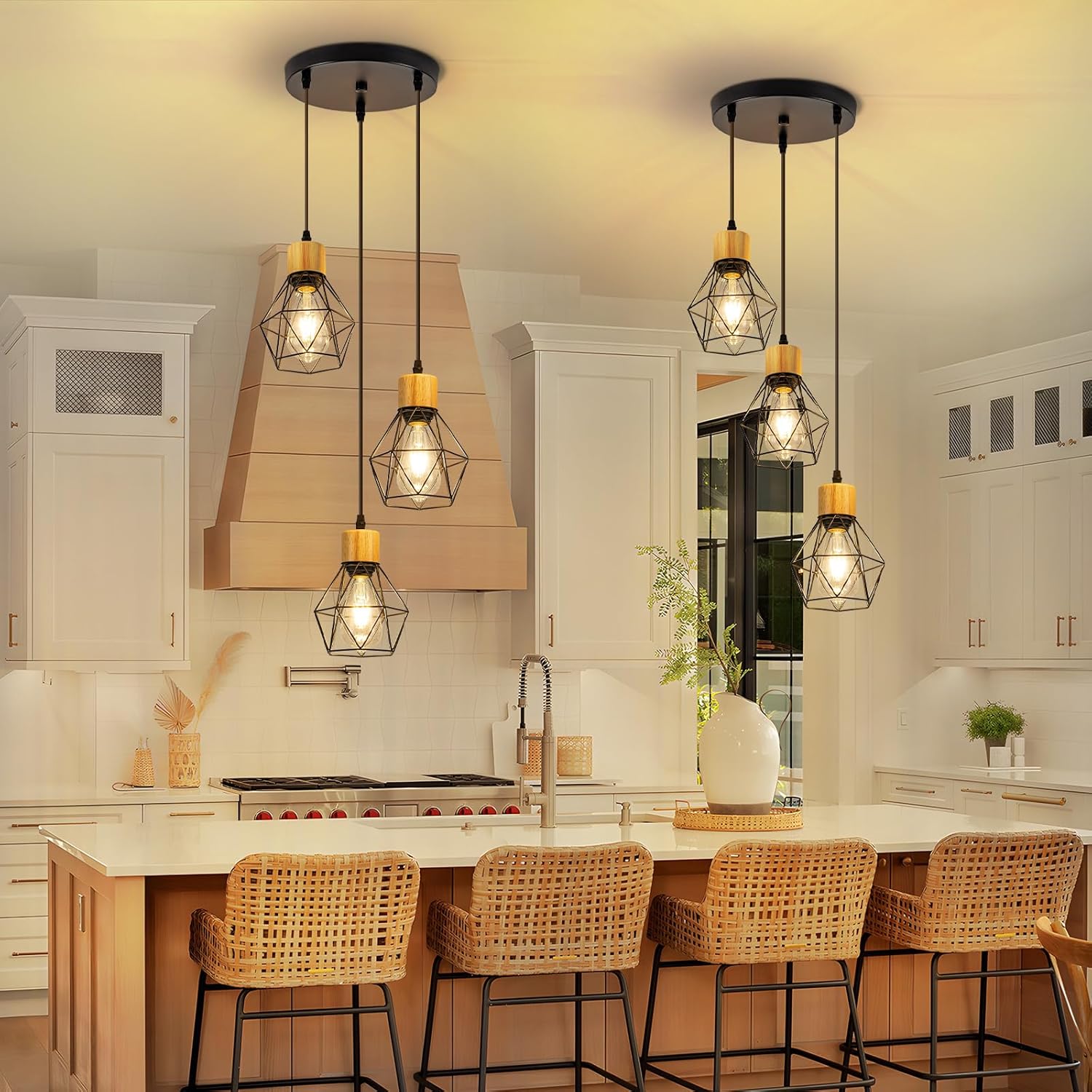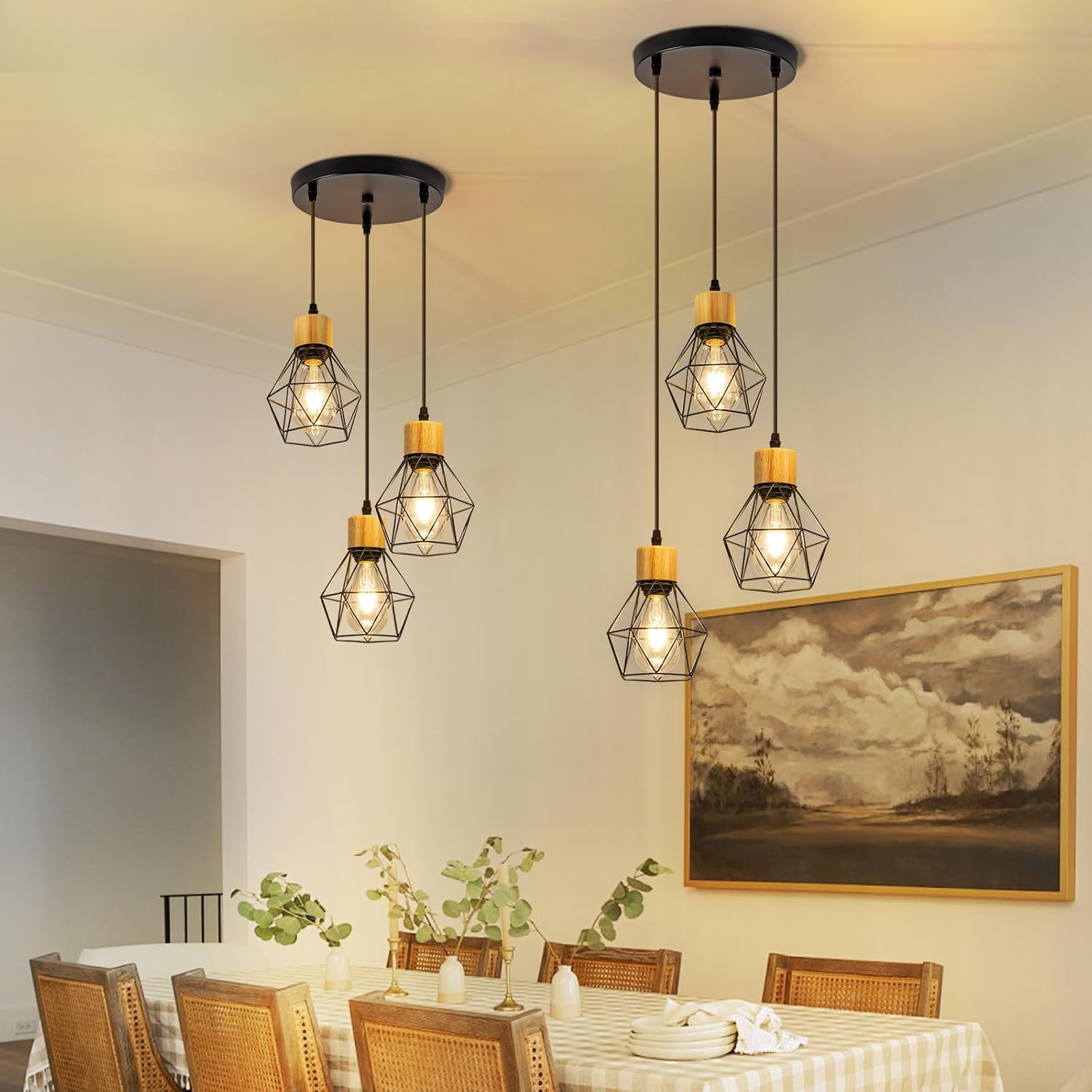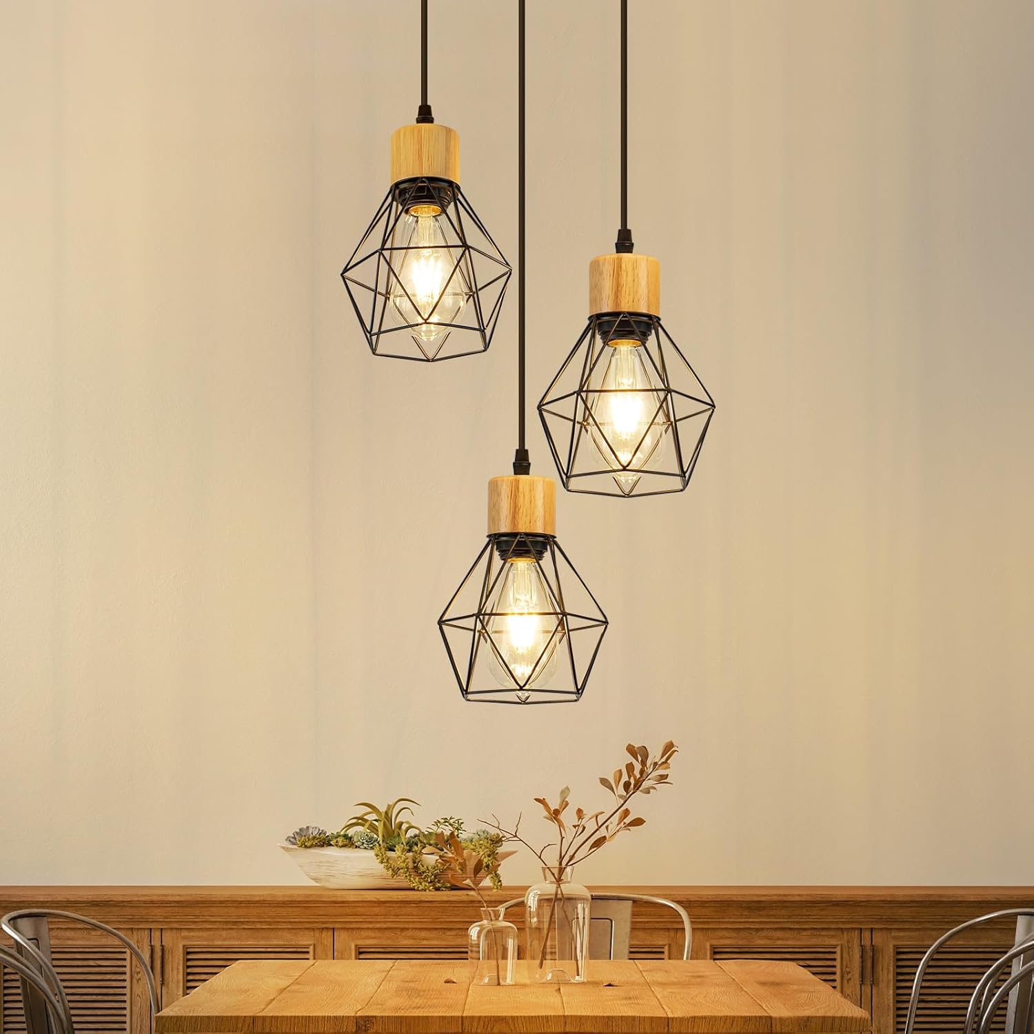 Ainutlaatuinen teollisen tyylin muotoilu: Timanttityyliset ruokailupöydän ripsivalaisimen varjostimet on valmistettu metallista ja mattamustasta pintakäsittelystä, jotka sulautuvat retro-ilmapiiriin. Tämä muotoilu yhdistetään helposti eri sisustustyyyleihin huoneen kokonaiskauneuden parantamiseksi.