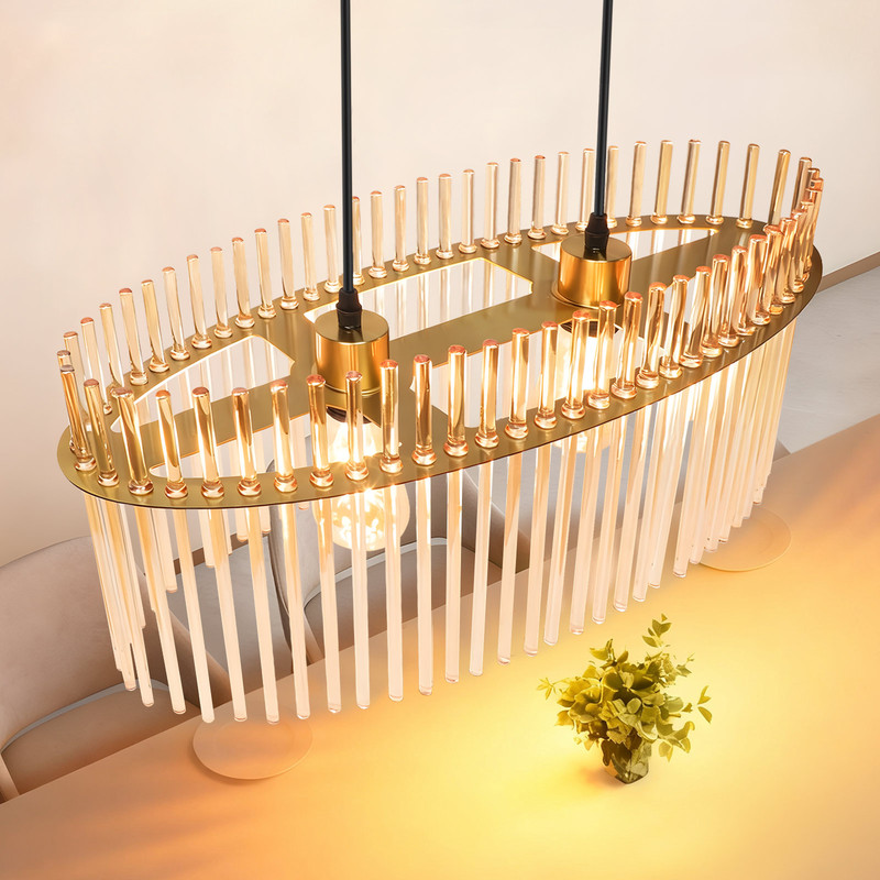 Moderni ja ylellinen muotoilu: Tämä pöytäriippuvalaisin yhdistää metallin hienostuneisuuden kirkkaan lasin eleganssiin tyylikkään ruokailutilan luomiseksi. Metalliosa on tukeva ja kiiltävä, lasiputket ovat läpinäkyviä ja puhtaita, ja linjat ovat yksinkertaisia mutta elegantteja. Päällä ollessaan tämä ruokailutilan riippuvalaisin levittää kaunista taittunutta valoa, joka luo pehmeän, monikerroksisen hehkun.