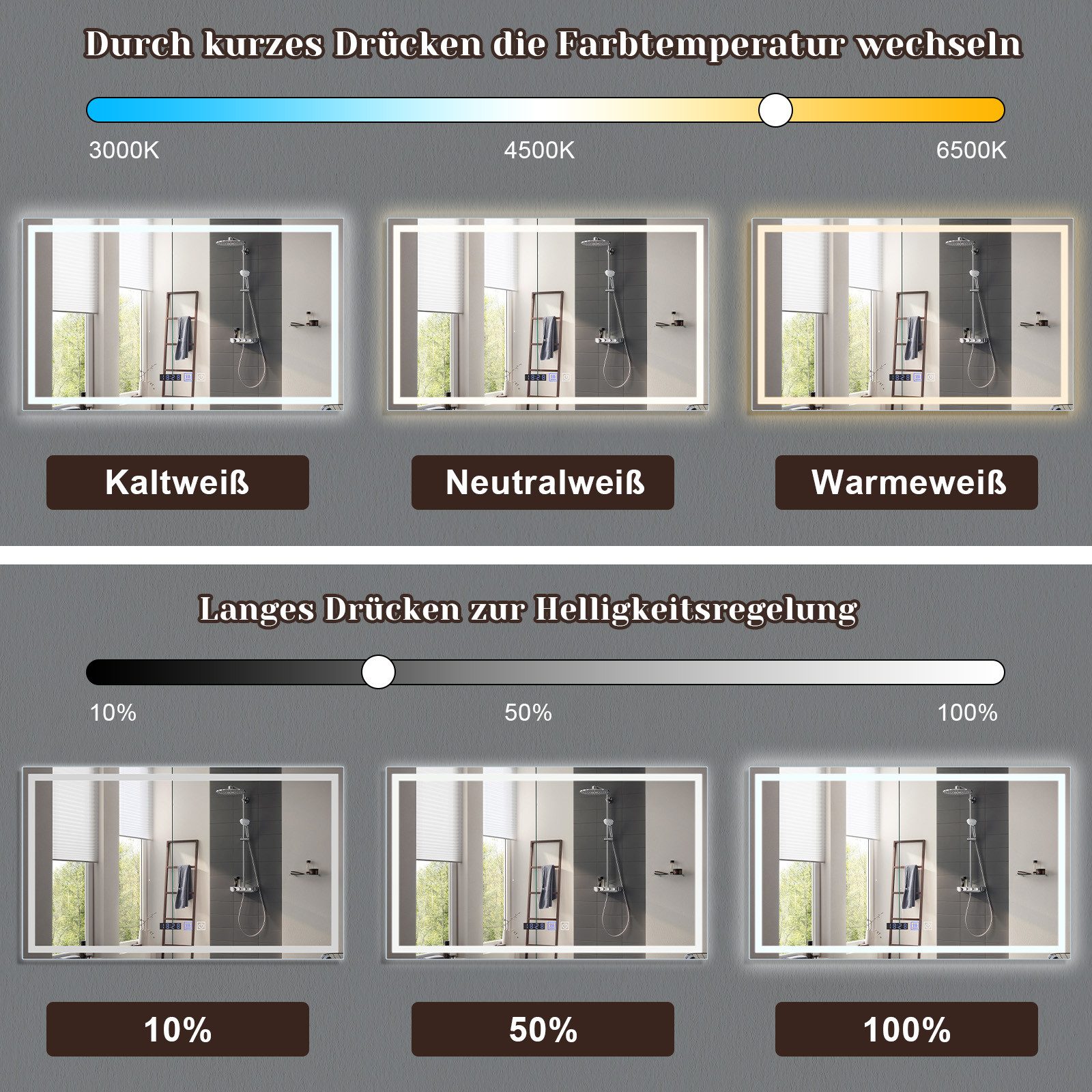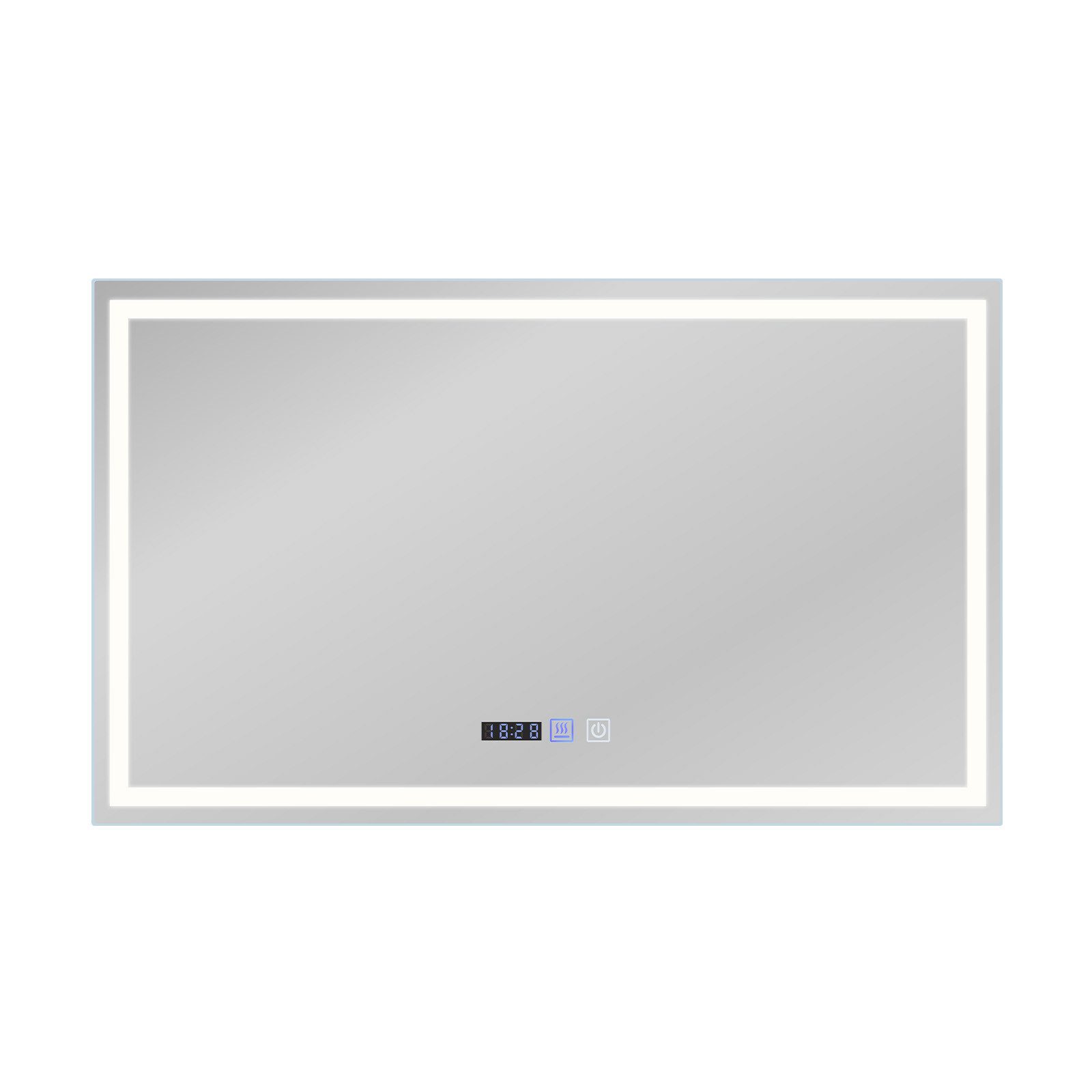 Kylpyhuoneen peili valoilla: Tämä kylpyhuoneen peili yhdistää modernin muotoilun ja edistykselliset ominaisuudet. Siinä on kosketusohjaimet himmennystä, kirkkauden säätöä ja huurteenpoistotoimintoa varten, mikä varmistaa, että olet tyytyväinen jokaiseen käyttökertaan. Nauti ihanteellisesta valaistuskokemuksesta. Himmennettävä: Tässä kylpyhuoneen peilissä on kosketushimmennystoiminto. Lyhyt painallus kytkimestä mahdollistaa ihanteellisen valon värin valitsemisen lämpimän valkoisen, neutraalin valkoisen ja kylmän valkoisen (3000K-6500K) välillä vastaamaan erilaisia tarpeitasi. Pitkä painallus mahdollistaa kirkkauden helpon säätämisen 10 %:sta 100 %:iin. Kytkimen painaminen uudelleen pitkään mahdollistaa kirkkauden hienosäädön alhaisesta korkeaan. Huurteenpoisto: Tässä kylpyhuoneen peilissä on huurteenpoistotoiminto, joka varmistaa, että peilin pinta pysyy kirkkaana myös kosteissa olosuhteissa. Huurteenpoistotoiminto estää peilin huurtumisen suihkun tai kylvyn jälkeen, joten voit käyttää peiliä selkeästi heti odottamatta. Räjähdyssuojattu lasi: Tämä LED-kylpyhuoneen peili on varustettu teräväpiirtoisella räjähdyssuojatulla lasilla, joka on valmistettu monikerroksisesta tai vahvistetusta lasista. Tämä parantaa lasin iskunkestävyyttä ja turvallisuutta, mikä vähentää merkittävästi ja tehokkaasti lasin rikkoutumisriskiä vahingossa tapahtuvien iskujen tai törmäysten vuoksi. Se tarjoaa myös selkeän heijastuksen, mikä tekee peilistä helpon puhdistaa ja huoltaa.