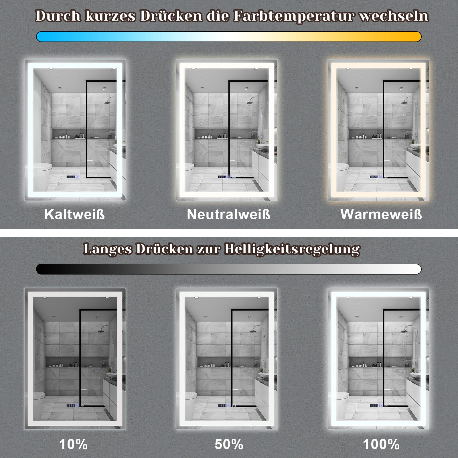 Himmennettävä: Tässä kylpyhuoneen peilissä on kosketushimmennystoiminto. Lyhyellä painalluksella voit valita ihanteellisen valon värin lämpimän valkoisen, neutraalin valkoisen ja viileän valkoisen (3000K-6500K) välillä vastataksesi erilaisiin tarpeisiisi. Pitkällä painalluksella voit helposti säätää kirkkautta 10 %:sta 100 %:iin. Painamalla kytkintä uudelleen pitkään, voit hienosäätää kirkkautta alhaisesta korkeaan.