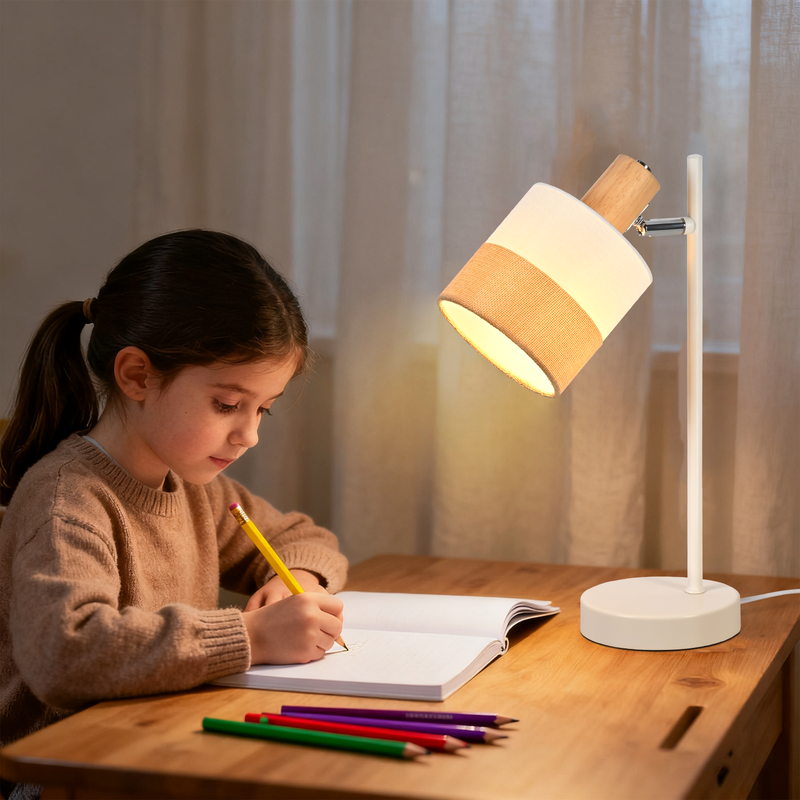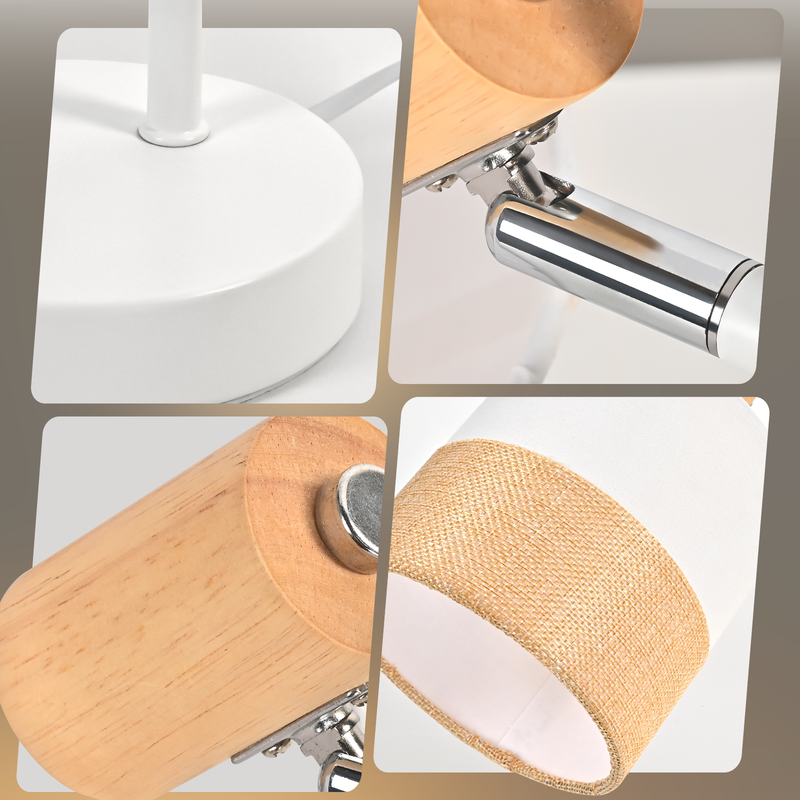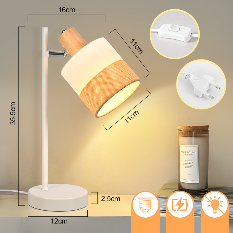 Ainutlaatuinen muotoilu: Olohuoneen pöytävalaisimessa on minimalistinen, moderni muotoilu, joka yhdistää täydellisesti estetiikan ja toiminnallisuuden. Kangasvarjostimia korostavat puumaiset yksityiskohdat, luoden luonnollisen ja yksinkertaisen tunnelman. Valkoinen metallijalusta on sekä tyylikäs että kestävä ja luja, sopien erilaisiin sisustustyyyleihin.
